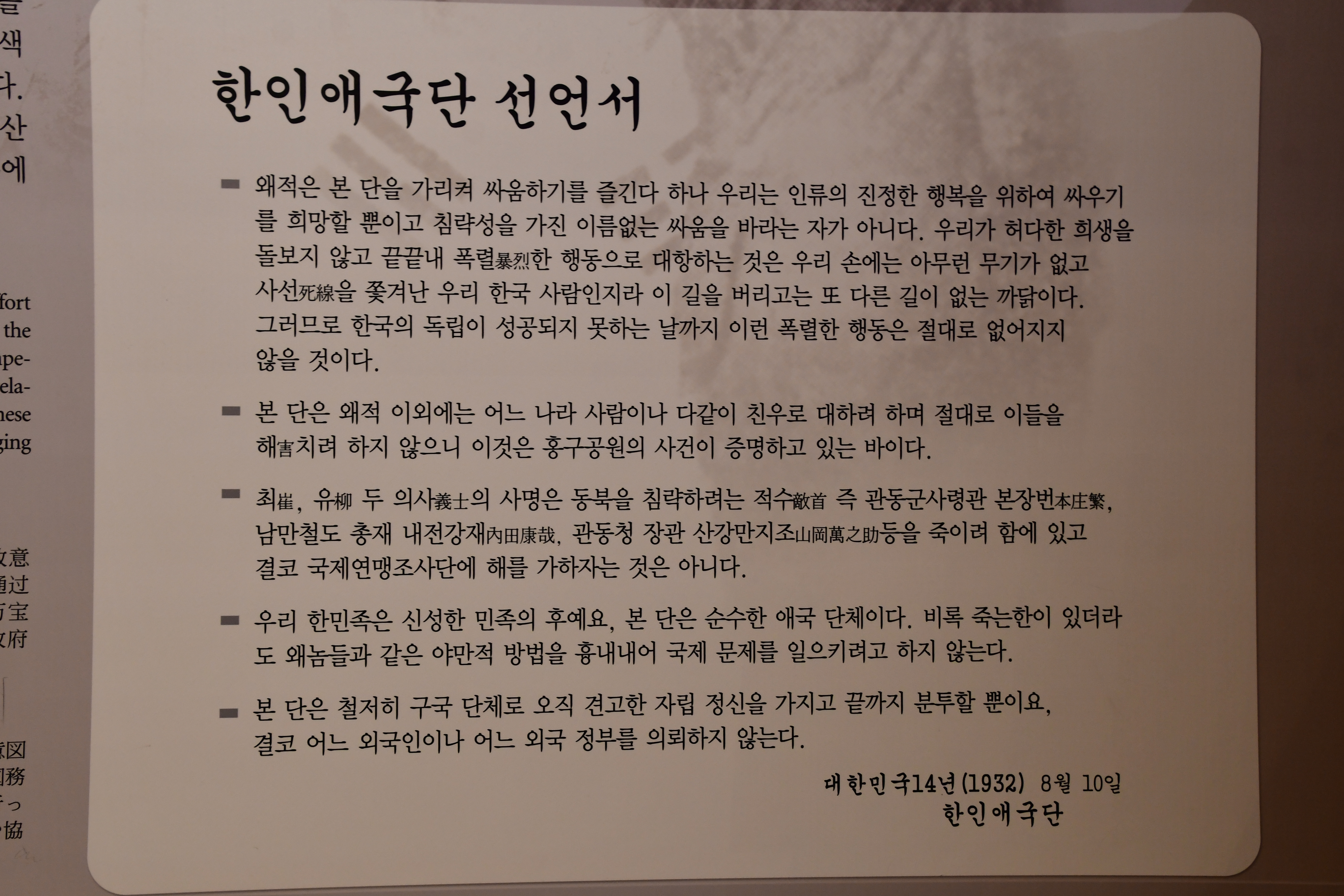 - 본 단은 왜적 이외에는 어느 나라 사람이나 다같이 친우로 대하려 하며 절대로 이들을 害해치려 하지 않으니 이것은 홍구공원의 사건이 증명하고 있는 바이다.