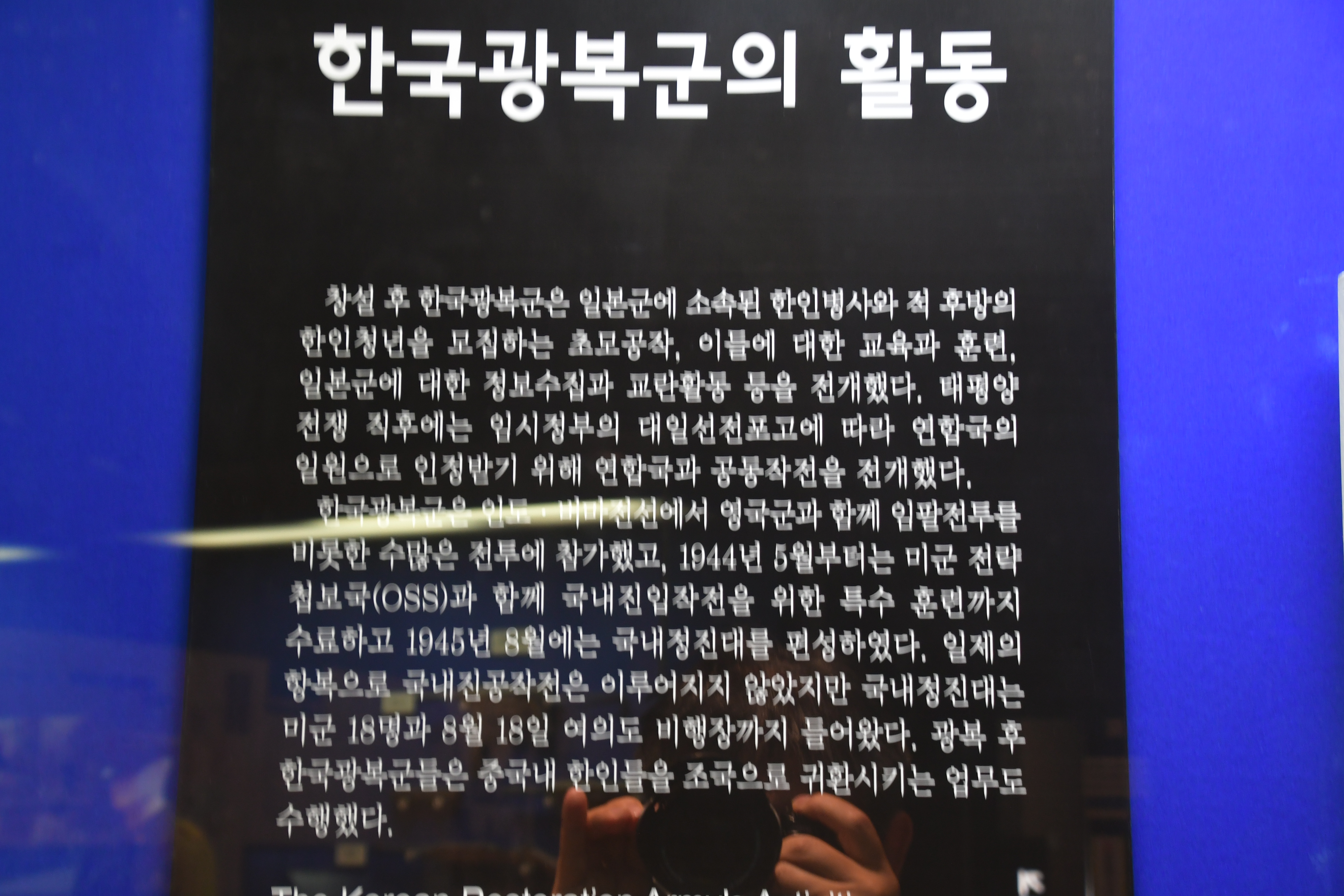 한국광복군은 인도, 버마전선에서 영국군과 함께 임팔전투를 비롯한 수많은 전투에 참전했고, 1944년 5월부터는 군대 전략 첩보국(OSS)과 함께 국내진입작전을 위한 특수훈련까지 수료하고 1945년 8월에는 국내정진대를 편성했다. 일제의 항복으로 국내진공작전은 이루어지지 않았지만 국내정진대는 미국 18명과 8월 18일 여의도 비행장까지 들어왔다. 광복 후 한국광복군은 중국내 한인들을 조국으로 귀환시키는 업무도 수행했다.