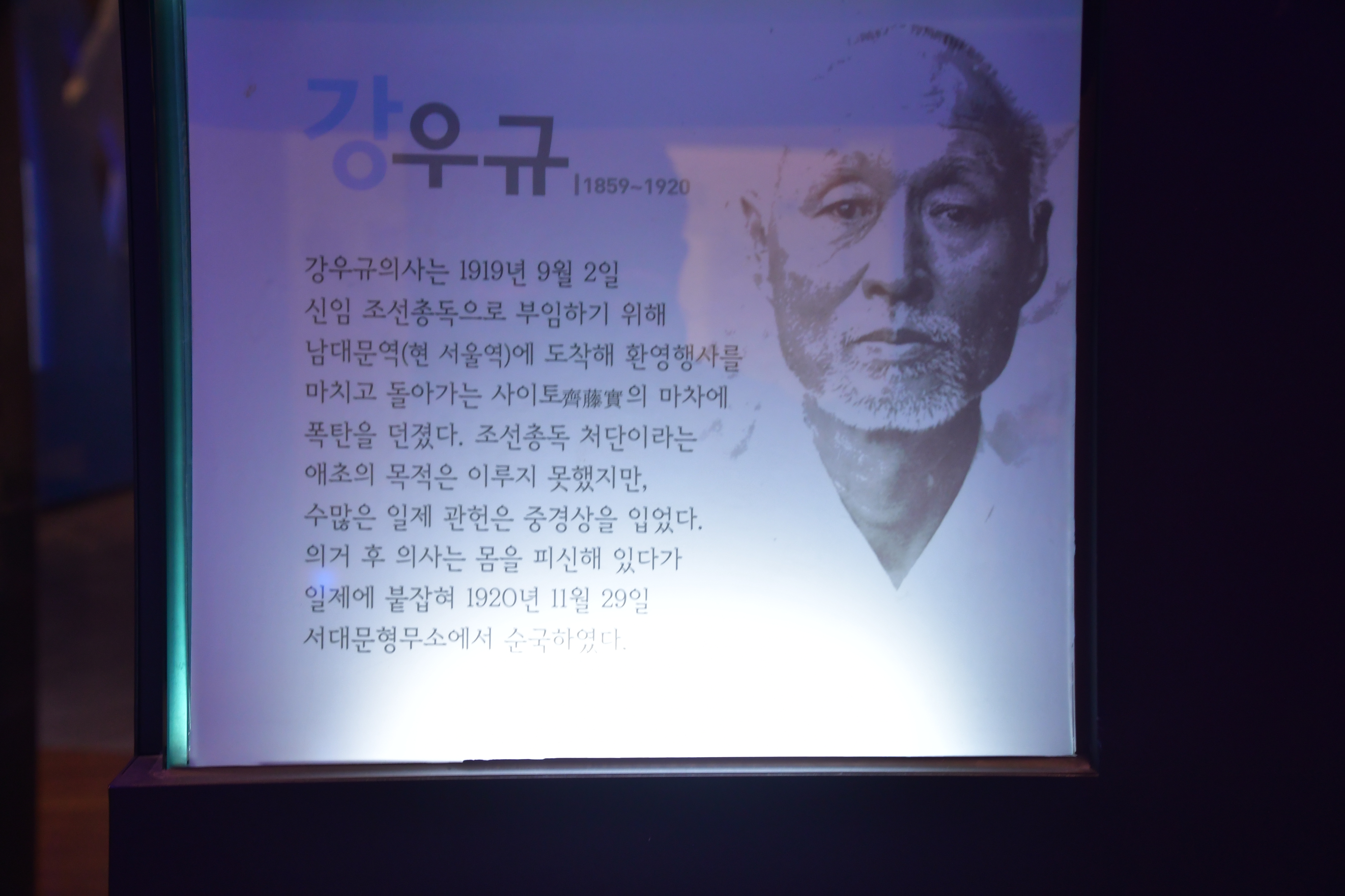 - 강우규는 1919년 9월 2일 신임 조선총독으로 부임하기 위해 남대문역(현 서울역)에 도착해 환영 행사를 마치고 돌아가는 사이토 齊藤實의 마차에 폭탄을 던졌다. 조선총독 처단이라는 애초의 목적은 이루지 못했지만, 수많은 일제 관헌은 중경상을 입었다. 의거 후 의사는 몸을 피신해 있다가 일제에 붙잡혀 1920년 11월 29일 서대문형무소에서 순국하였다.