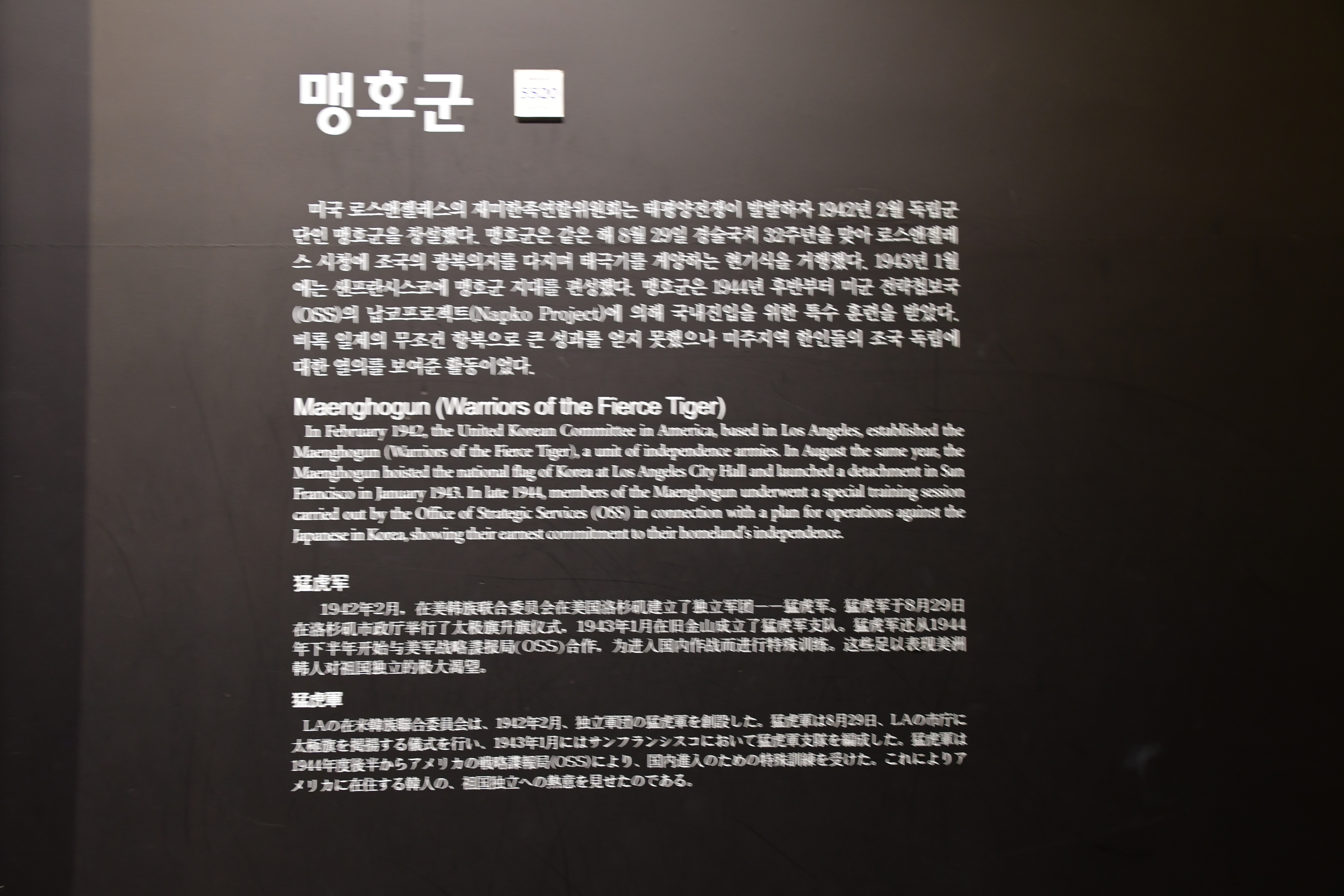 - 미국 로스앤젤레스의 재미한족연합위원회는 태평양전쟁이 발발하자 1942년 2월 독립군 단인 맹호군을 창설했다. 맹호군은 같은 해 8월 29일 경술국치 32주년을 맞아 로스앤젤레스 시청에 조선의 광복의지를 다스리고 태극기를 게양하는 현기식을 거행했다. 1943년 1월은 샌프란시스코에 맹호군 지부를 편성했다. 맹호군은 1944년 후반부터 미군 전략첩보국(OSS)의 납코프로젝트에 의해 국내전업을 위한 특수 훈련을 받았다. 비록 일제의 무조건 항복으로 큰 성과를 얻지 못했으나 미주지역 한인들의 조선 독립에 대한 열의를 고려하는 활동이었다.