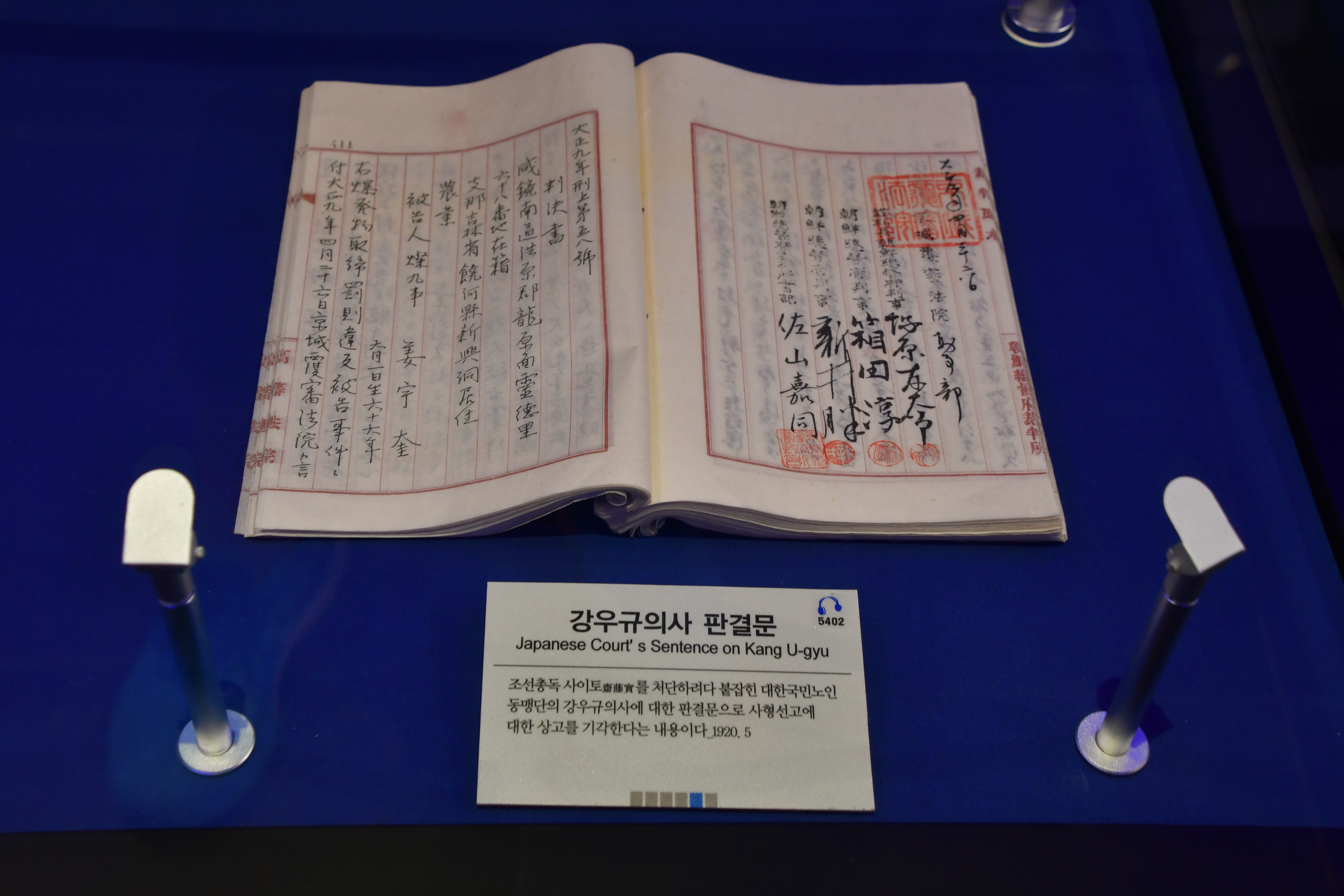 - 조선총독 사이토齋藤實를 처단하려다 붙잡힌 대한국민노인 동맹단의 강우규의사에 대한 판결문으로 사형선고에 대한 상고를 기각한다는 내용이다. <1920. 5.>