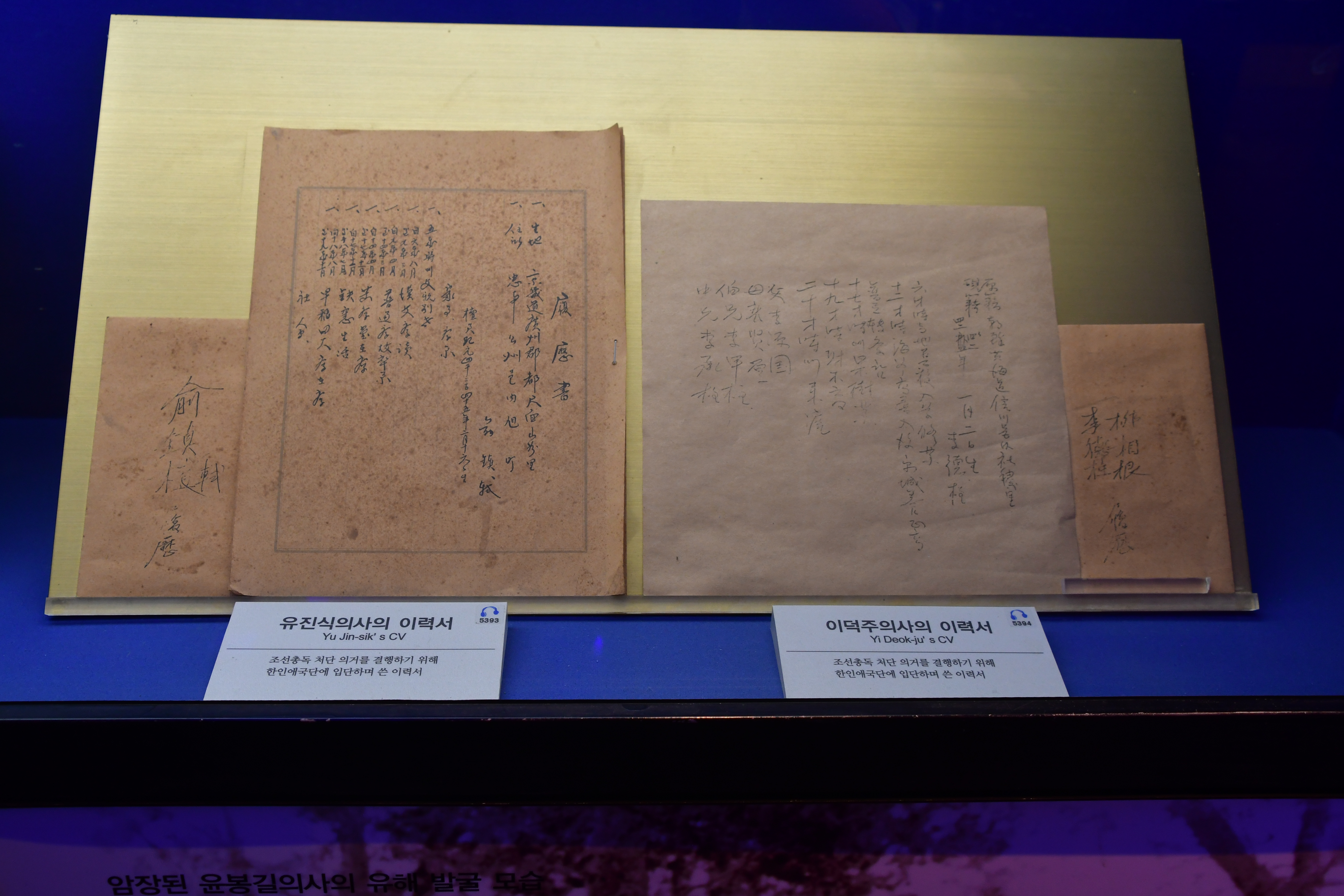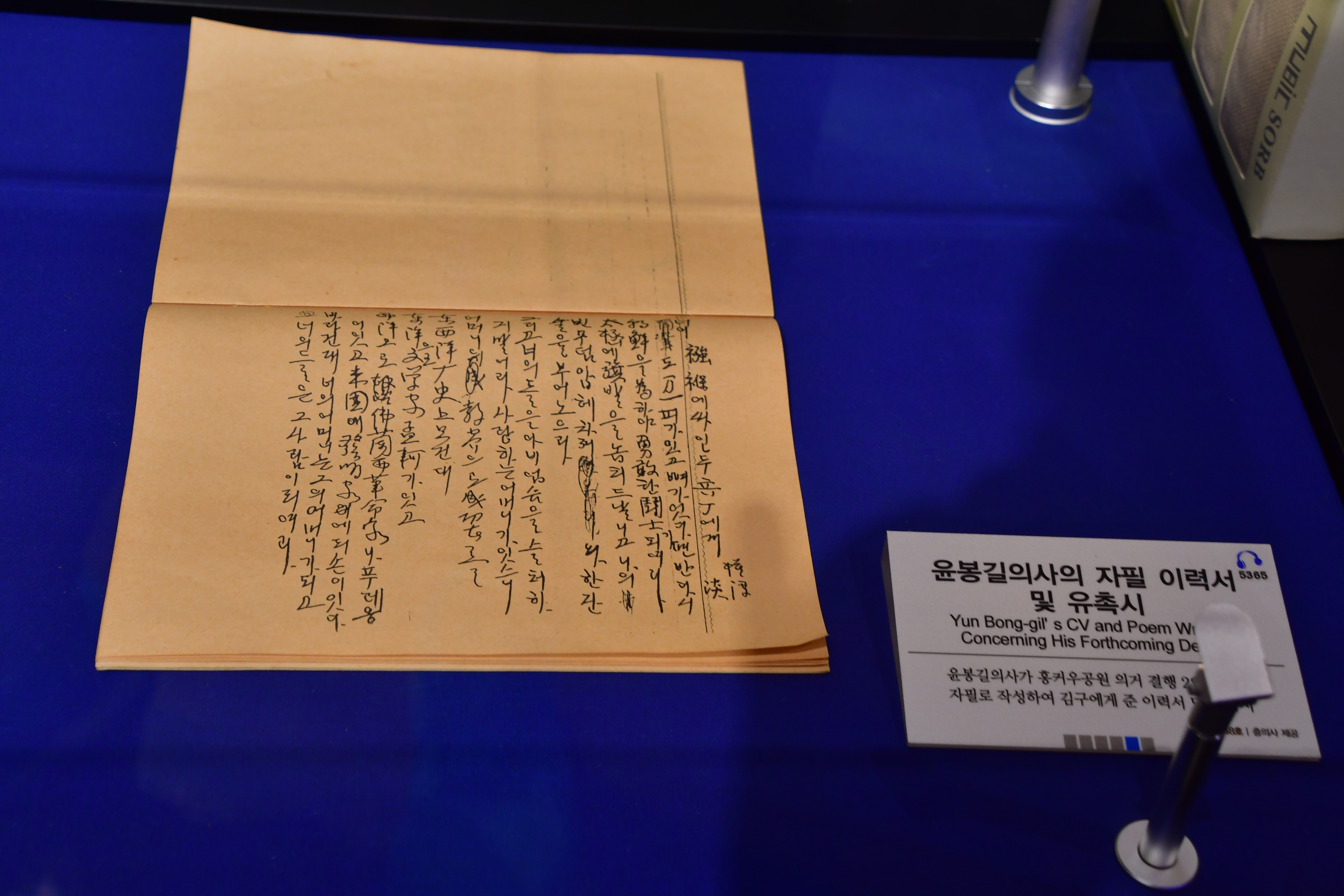 - 윤봉길의사가 홍커우공원 의거 결행 후 자필로 작성하여 김구에게 준 이력서 및 유촉시이다. <보물 568호. 충의사 제공.>