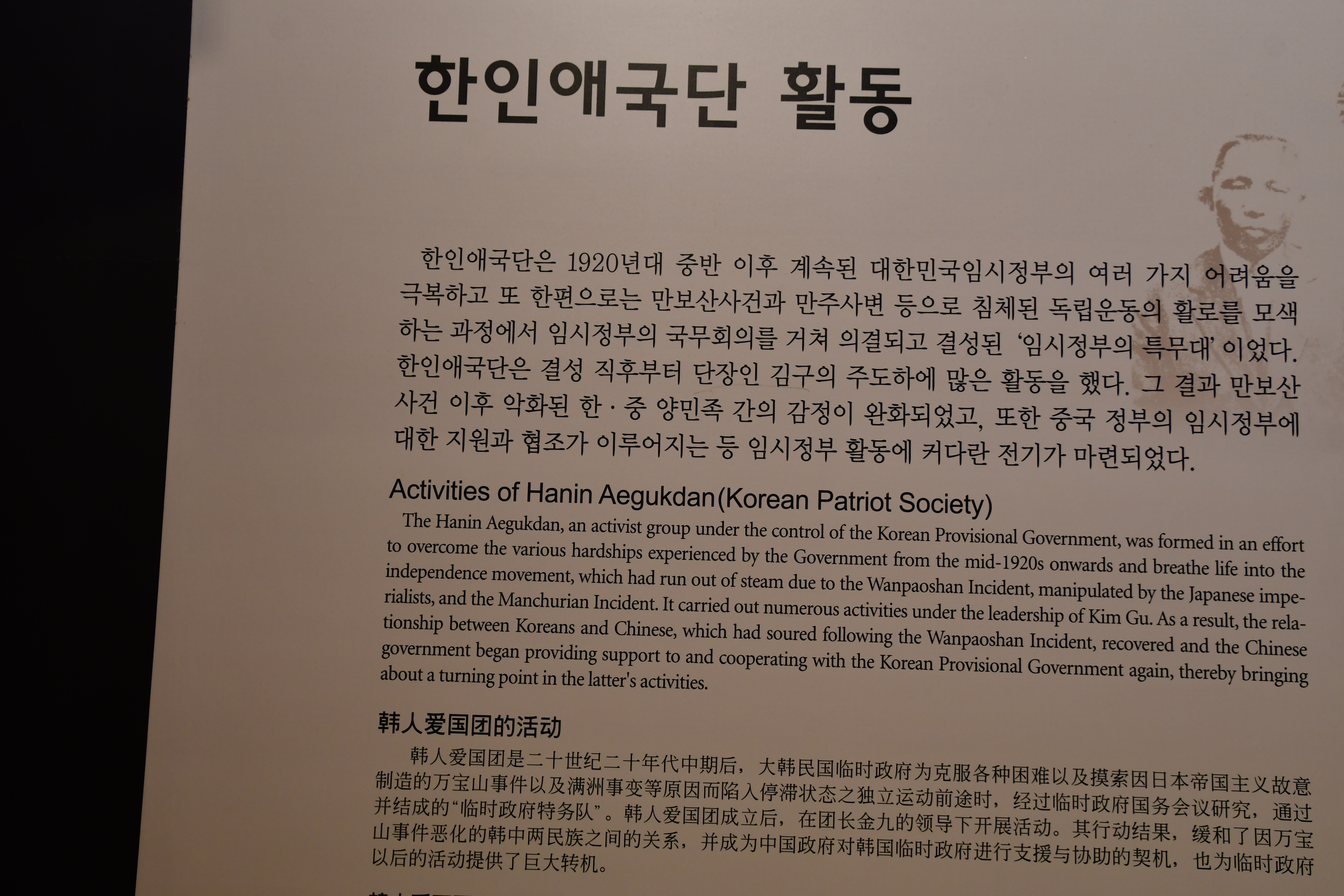 - 한인애국단은 1920년대 중반 이후 계속해서 대한민국임시정부의 여러 가지 어려움을 극복하고 또 한편으로는 만보산사건과 만주사변 등으로 침체된 독립운동의 활로를 모색하는 과정에서 임시정부의 국무회의를 거쳐 결성된 ‘임시정부의특무대’였다. 한인애국단은 결성 직후부터 단장인 김구의 주도하에 많은 활동을 했다. 그 결과 만보산사건 이후 악화된 한·중 양민족 간의 감정이 완화되었고, 또한 중국정부의 임시정부에 대한 지원과 협조가 이루어지는 등 임시정부 활동에 커다란 전기가 마련되었다.