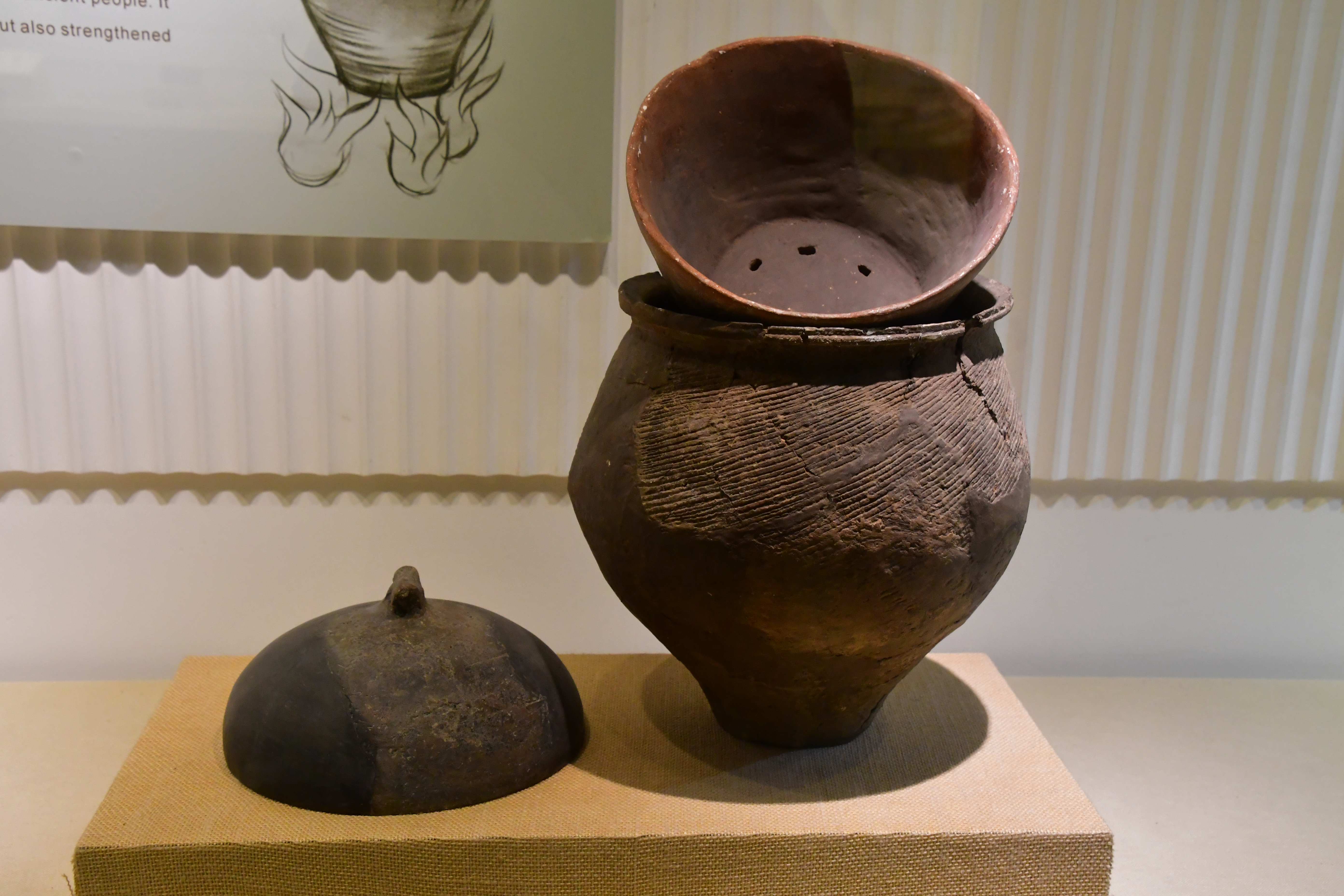◆ 右: 협사도관(夾砂陶罐)_모래 섞인 자갈로 빚은 질 단지.