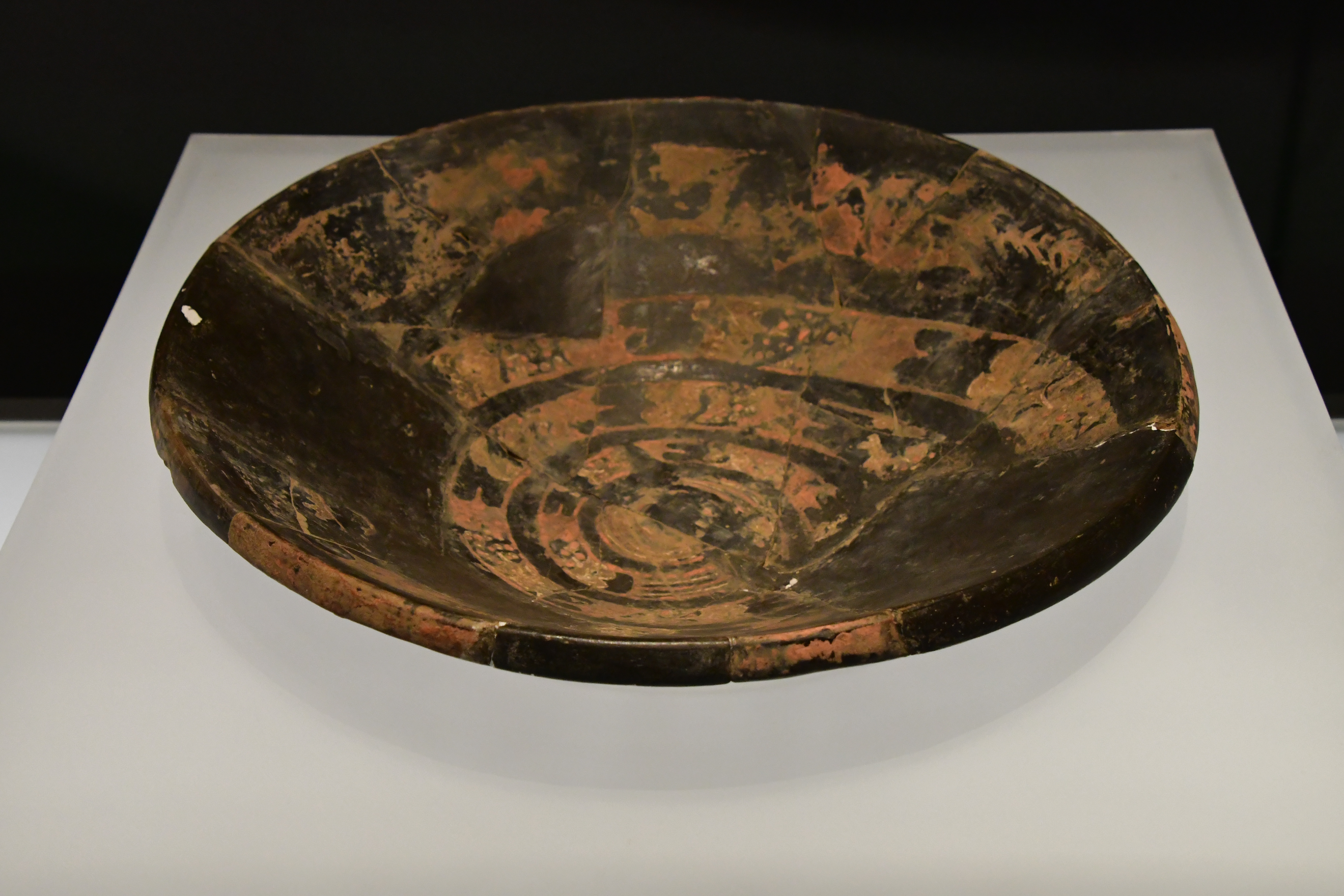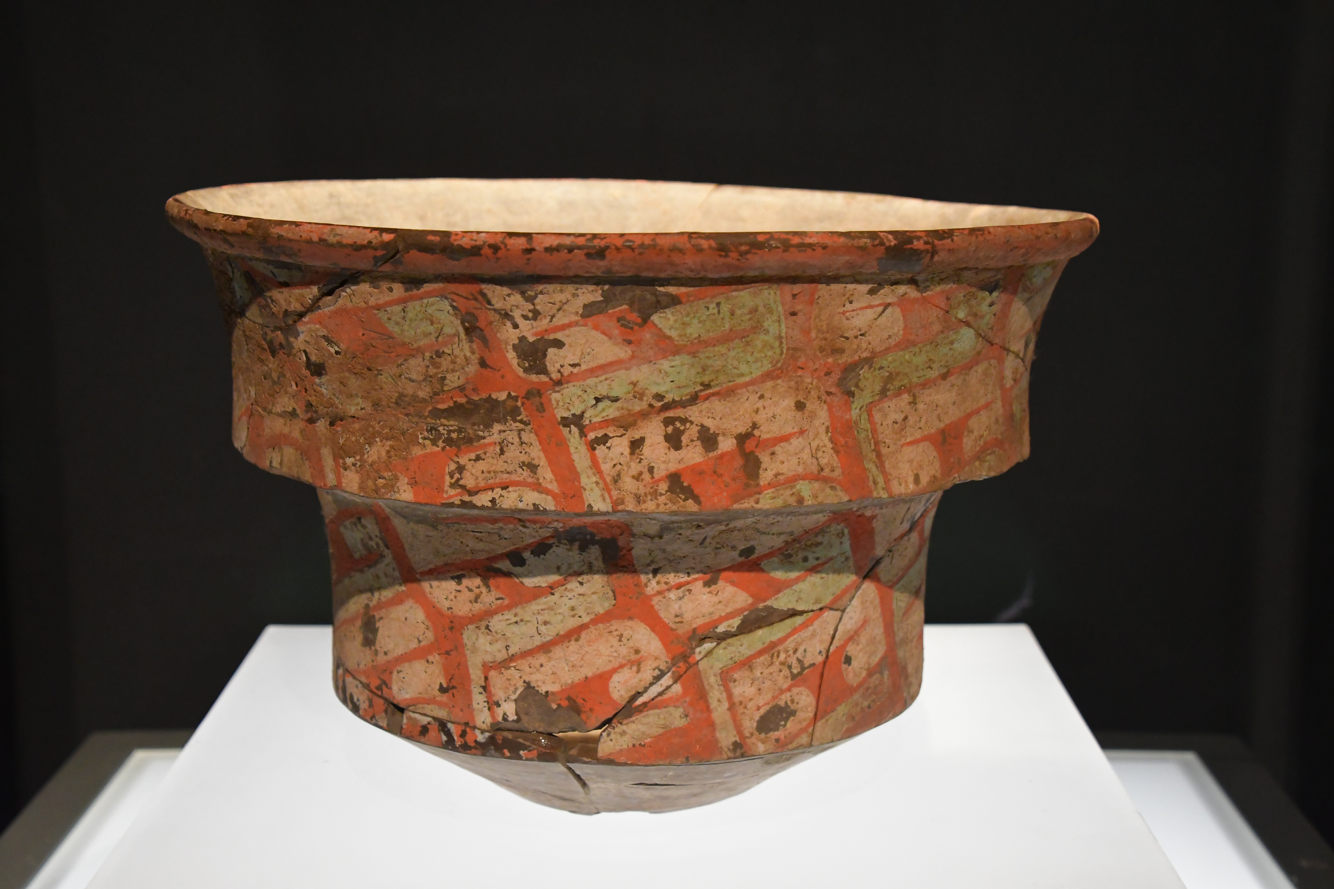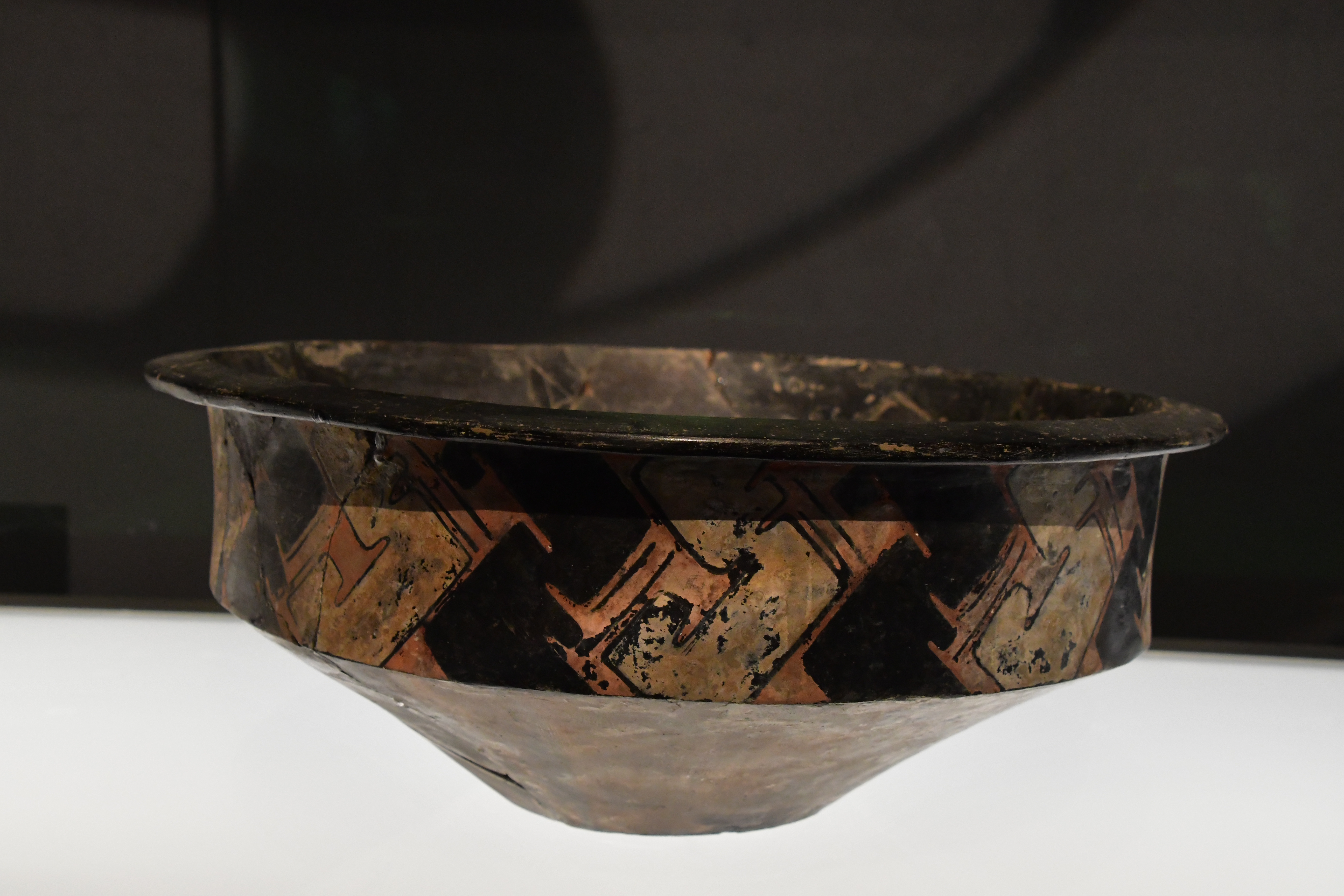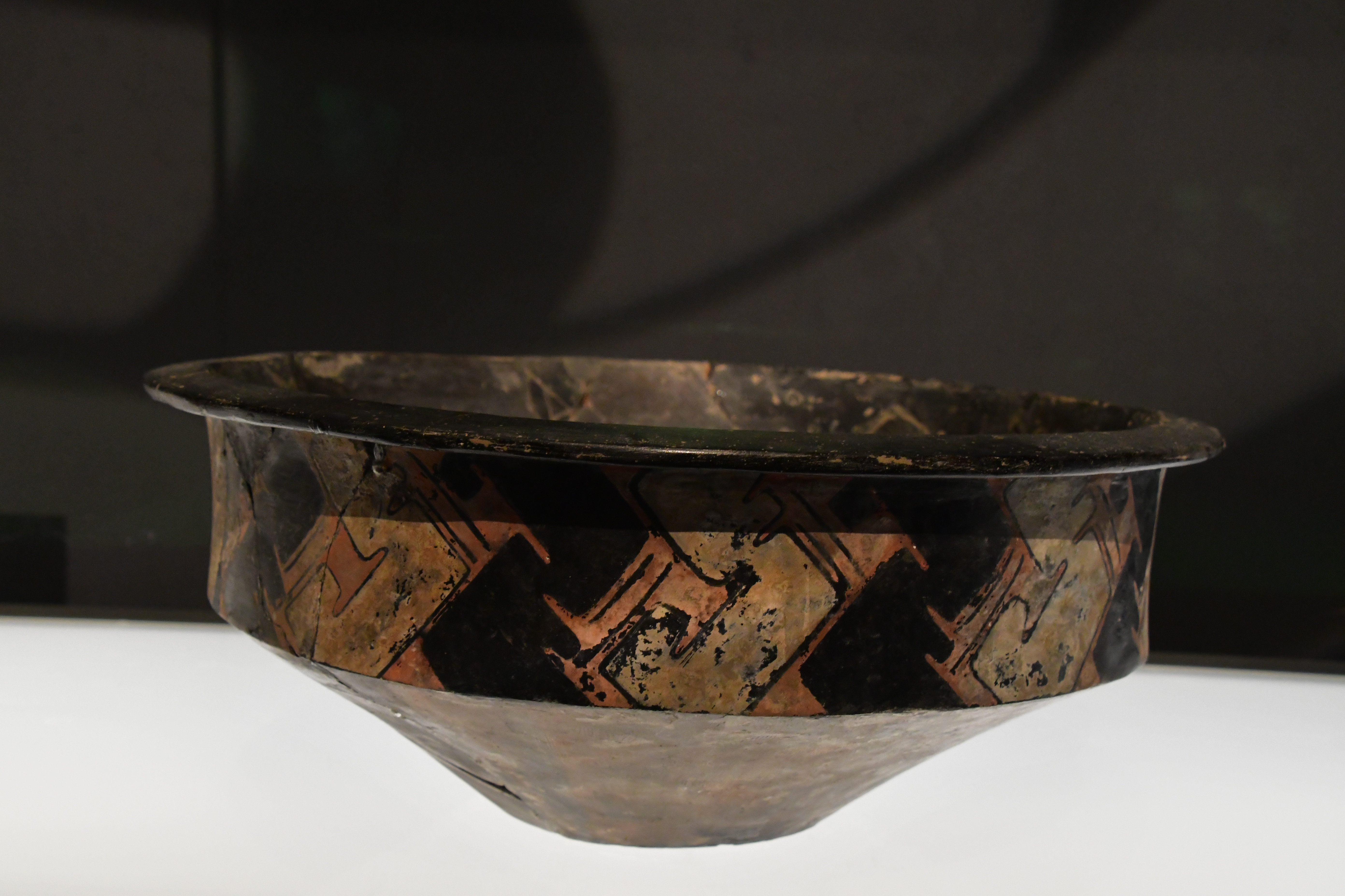 # 斑斓绚丽的彩绘陶器是陶寺礼器的一大特色。彩绘陶器因彩绘未烧结易污损而没有实用功能, 专为丧葬等礼仪活动制造。篮是盛稻、栗等谷类食物的食器, 在新石器时代晚期就已具有标志等级身份、祭祀等礼仪内涵。