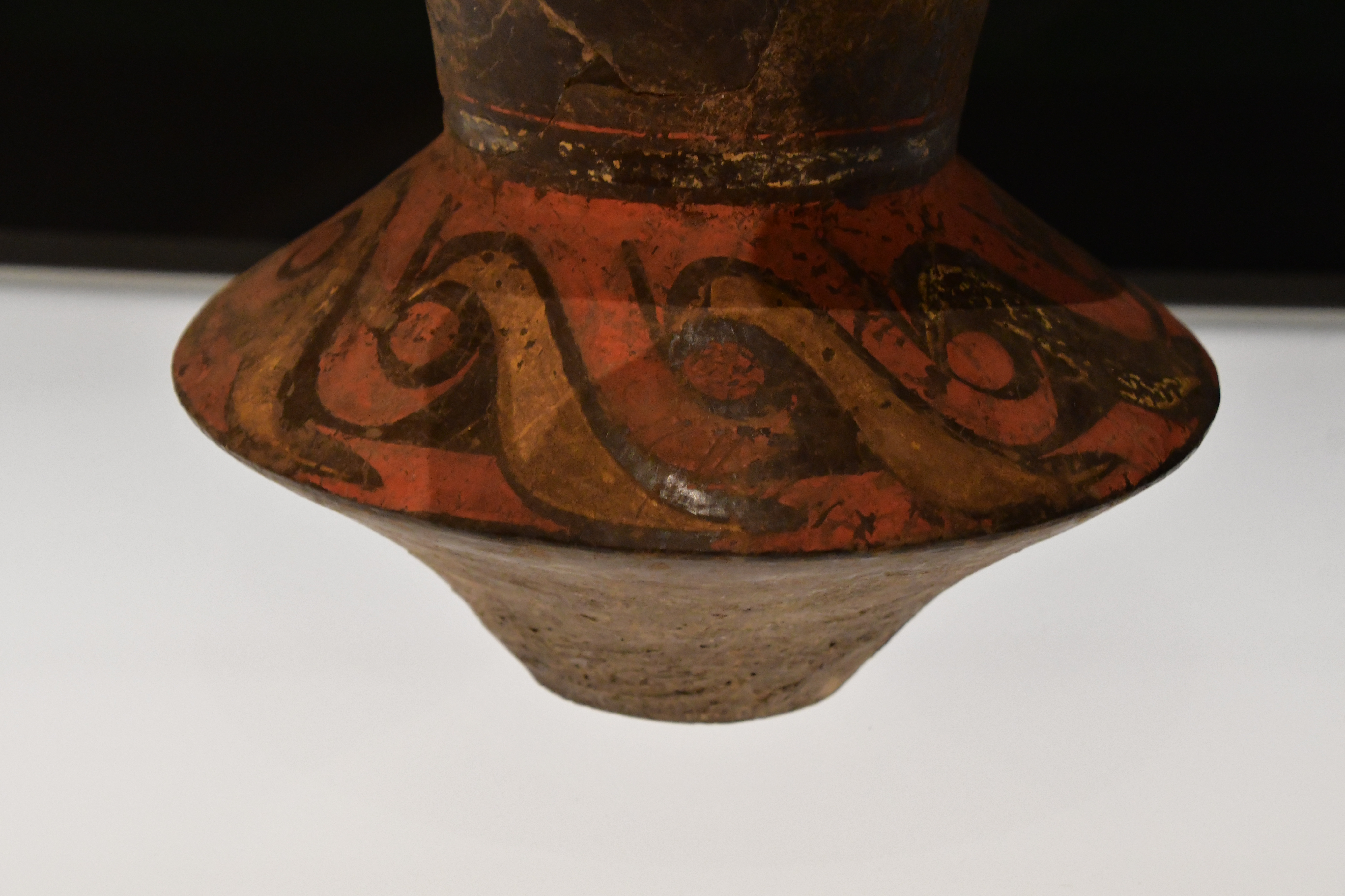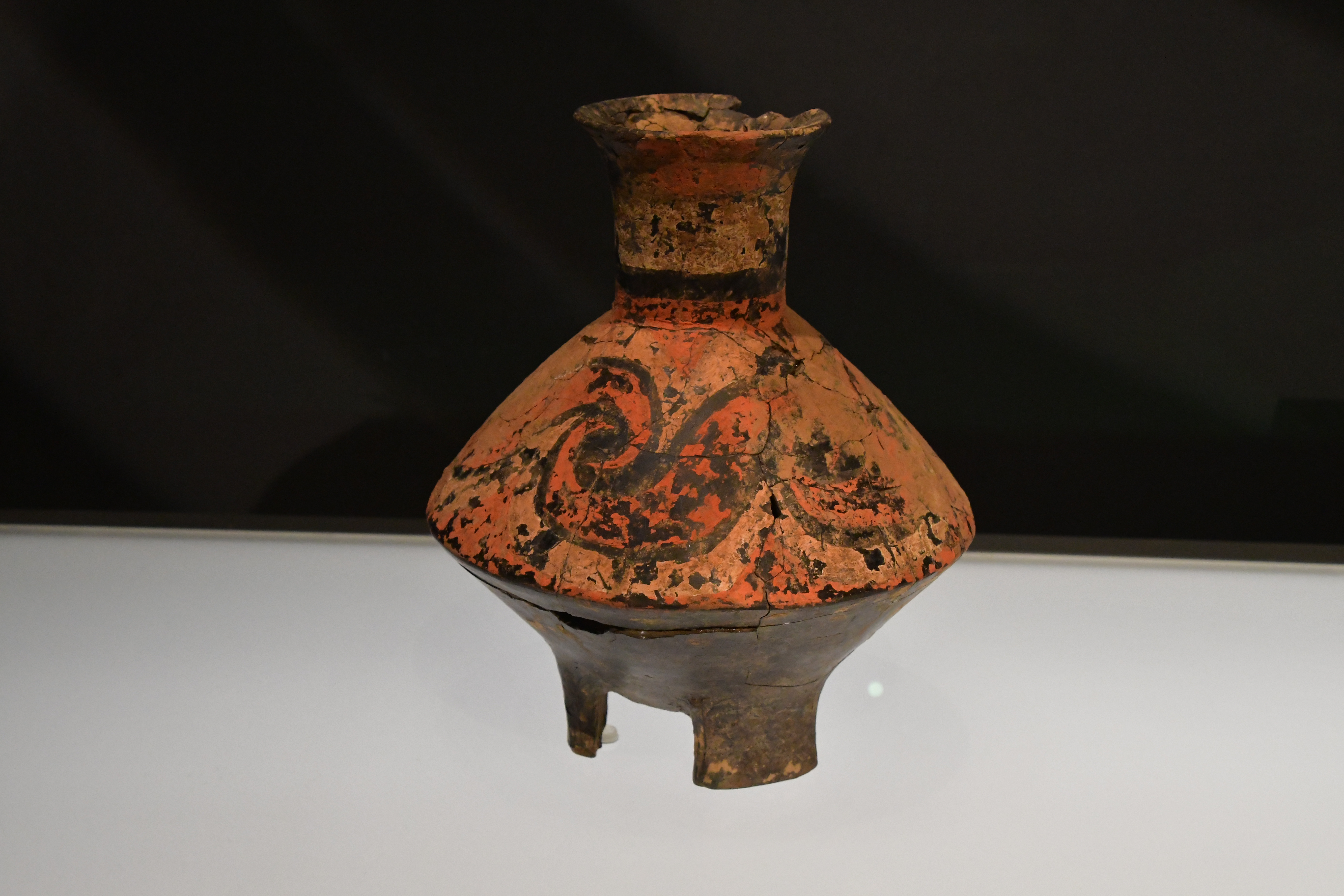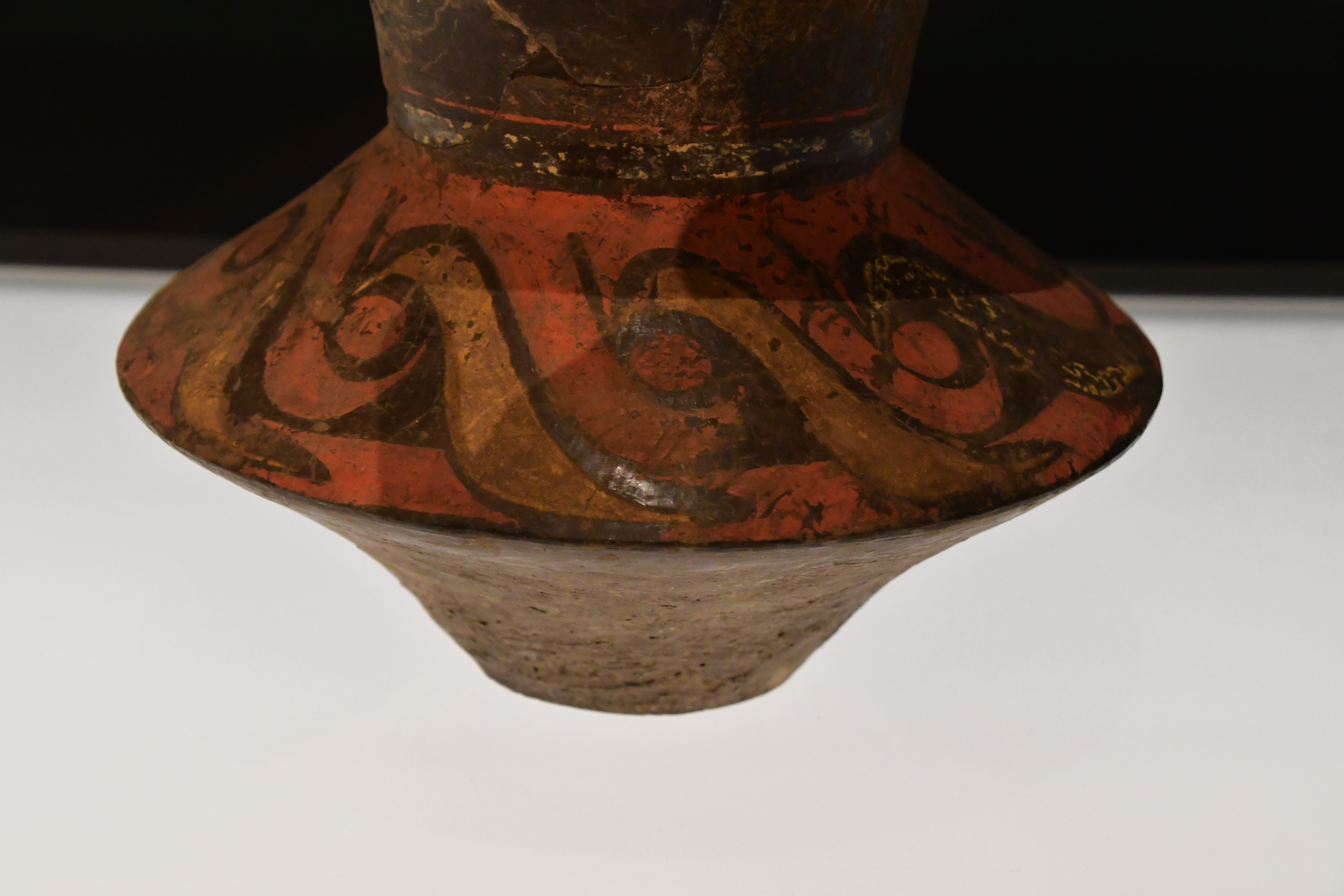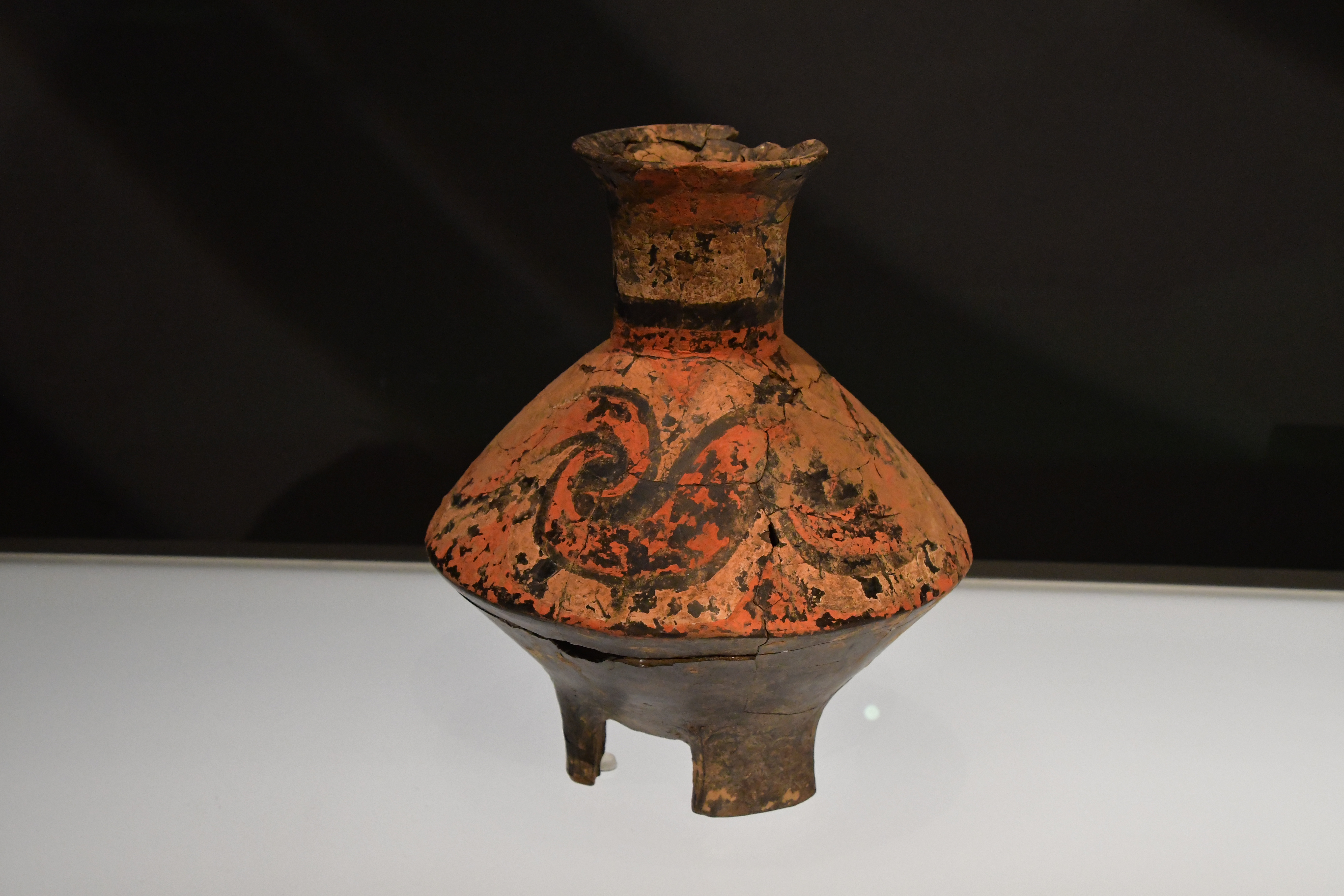 # 喇叭口, 斜折扇, 下腹部内收。器身施黑色陶衣, 并磨光。肩部用红、黄两色彩绘出勾状连涡纹。这两件彩绘陶壶出上于陶寺墓地最高等级墓葬之中, 出上时并列放置, 位于墓圹右侧。部分彩绘陶壶发现壶口有苫盖麻布的痕迹, 据此被认为是用来装酒。