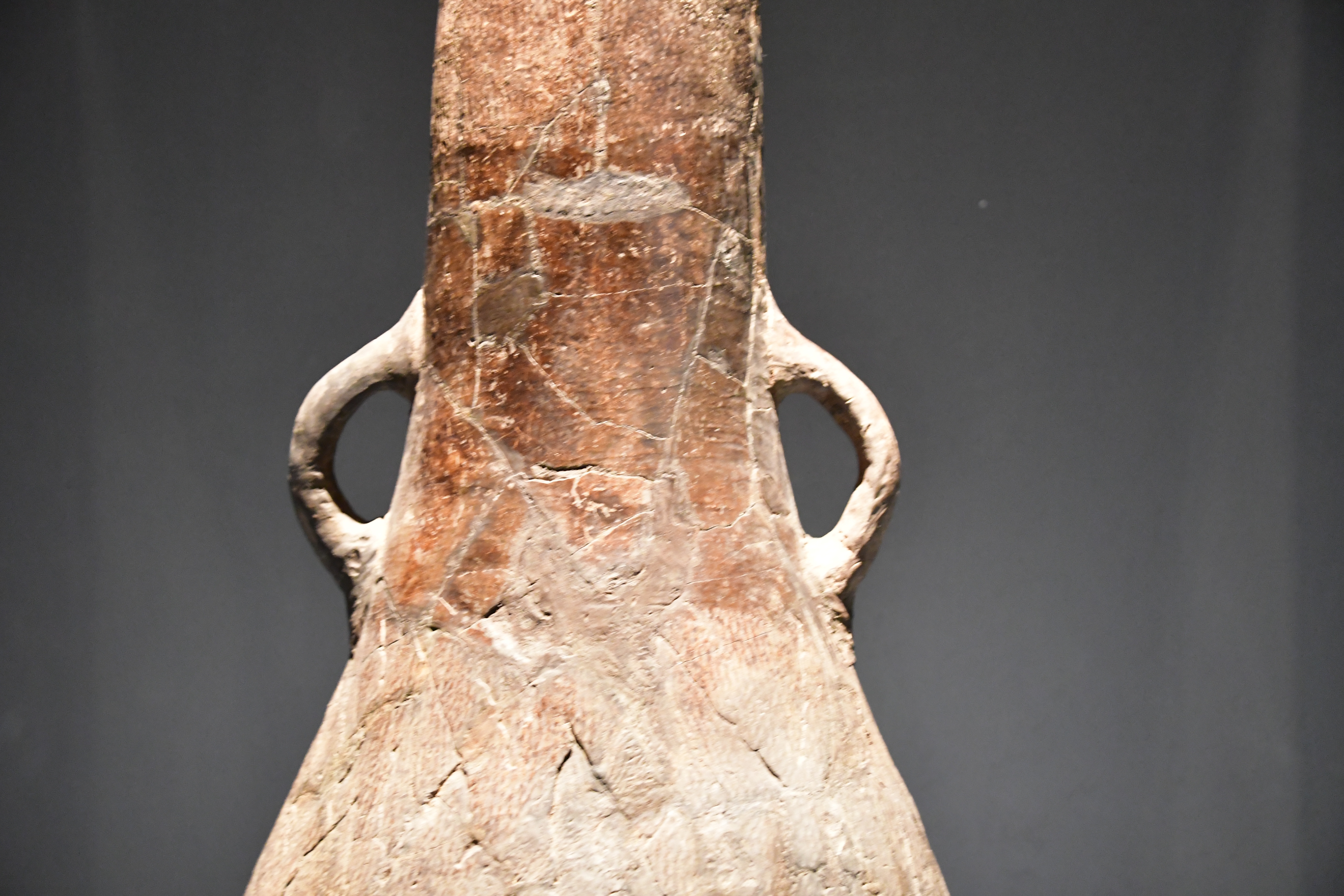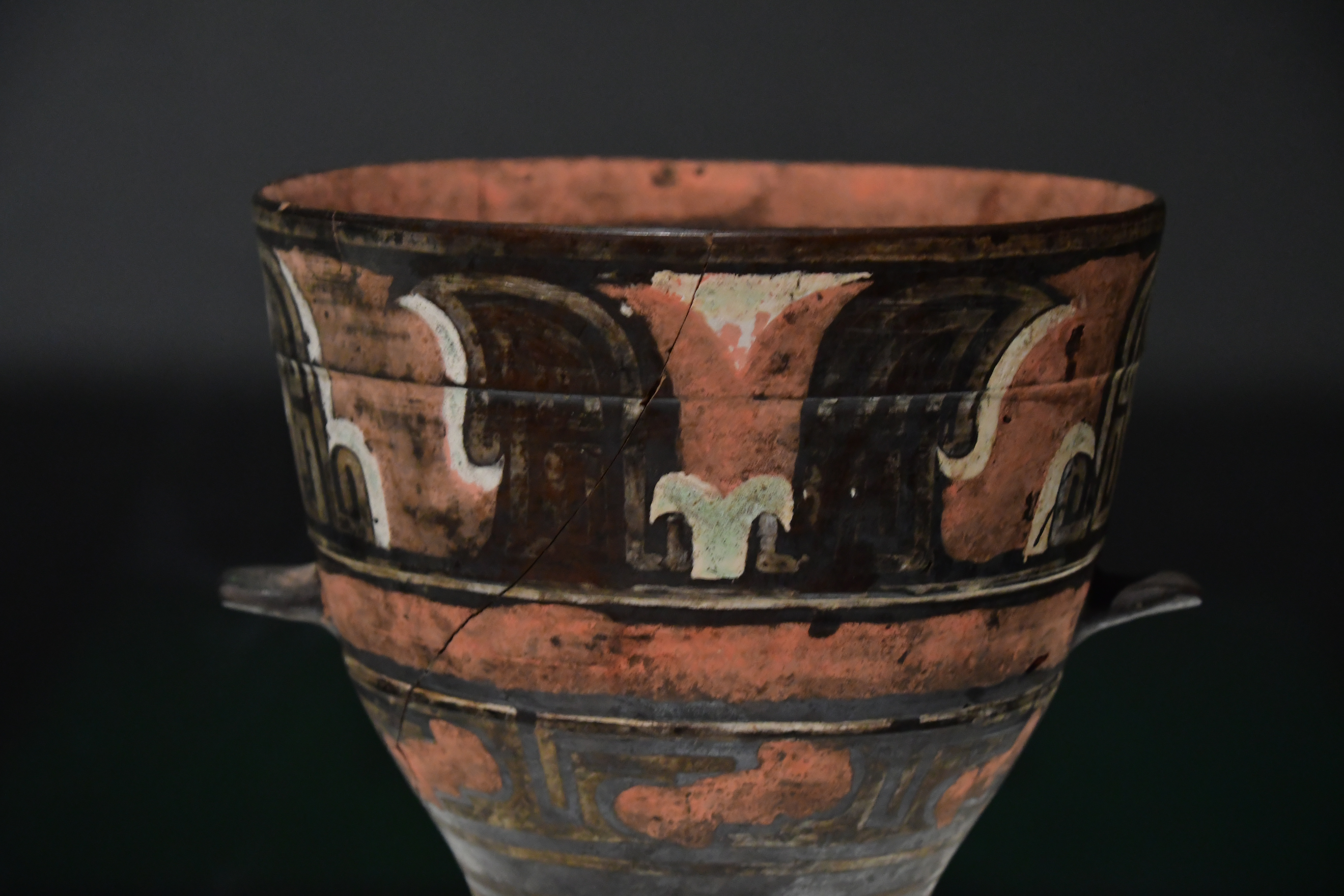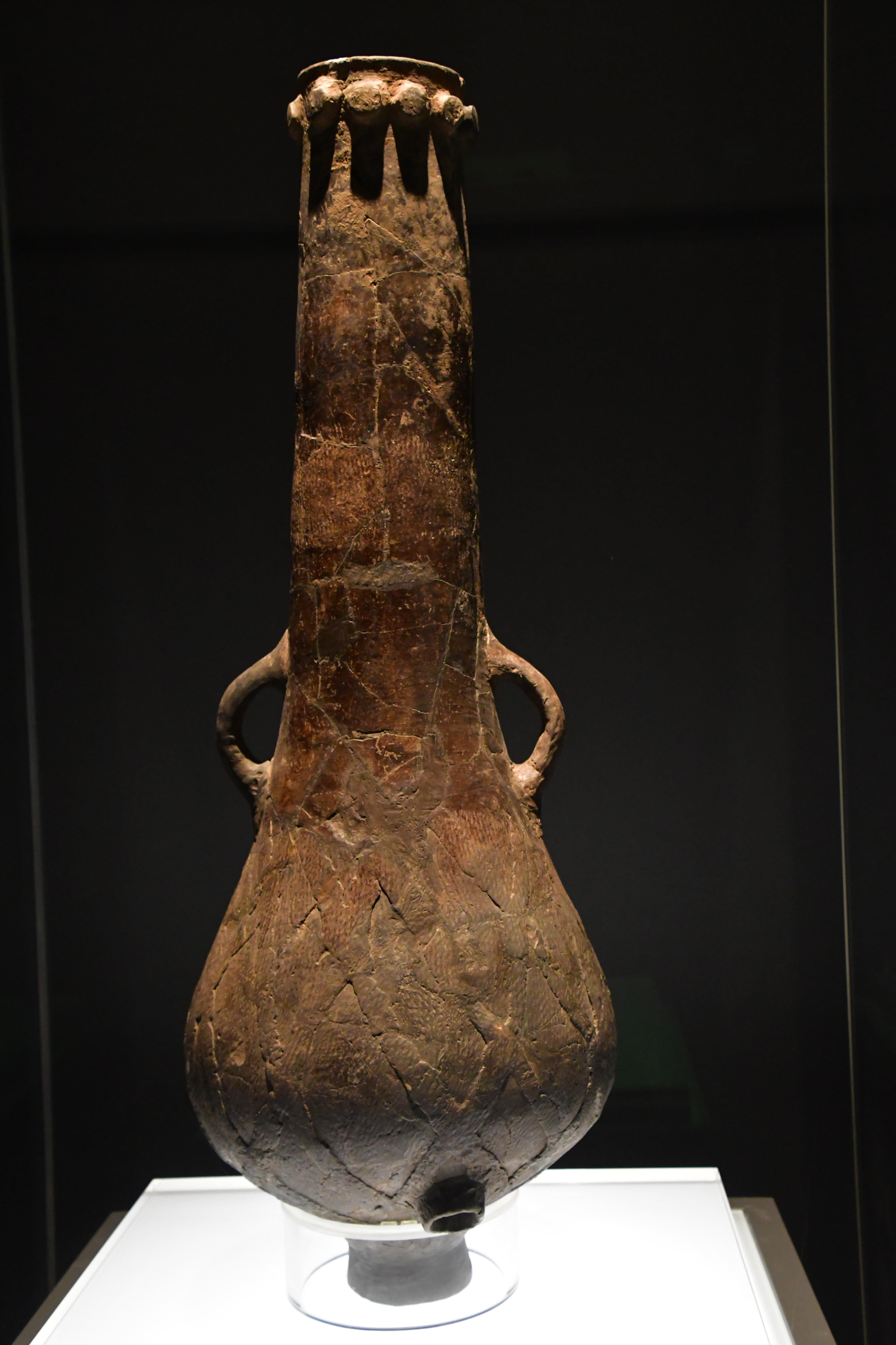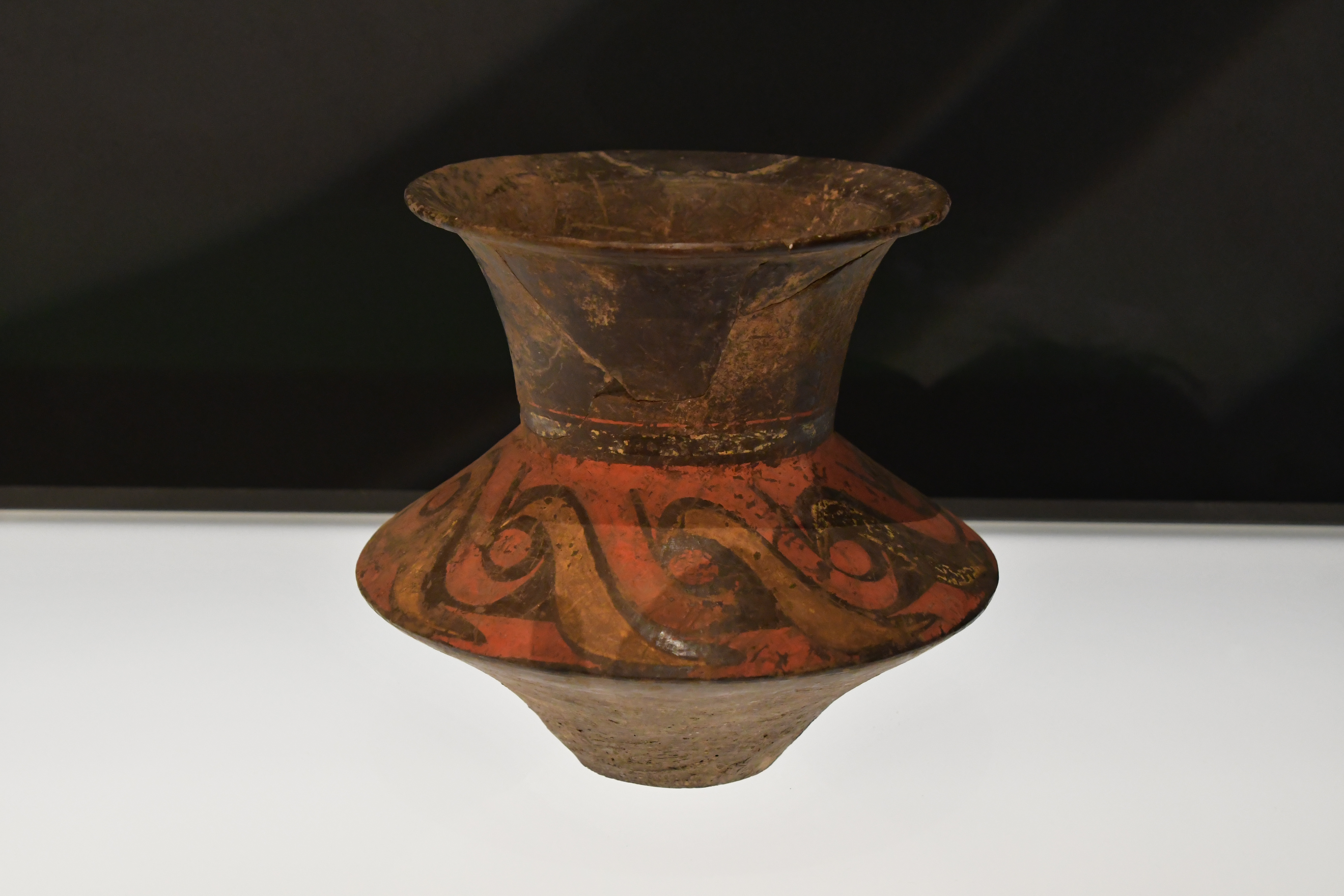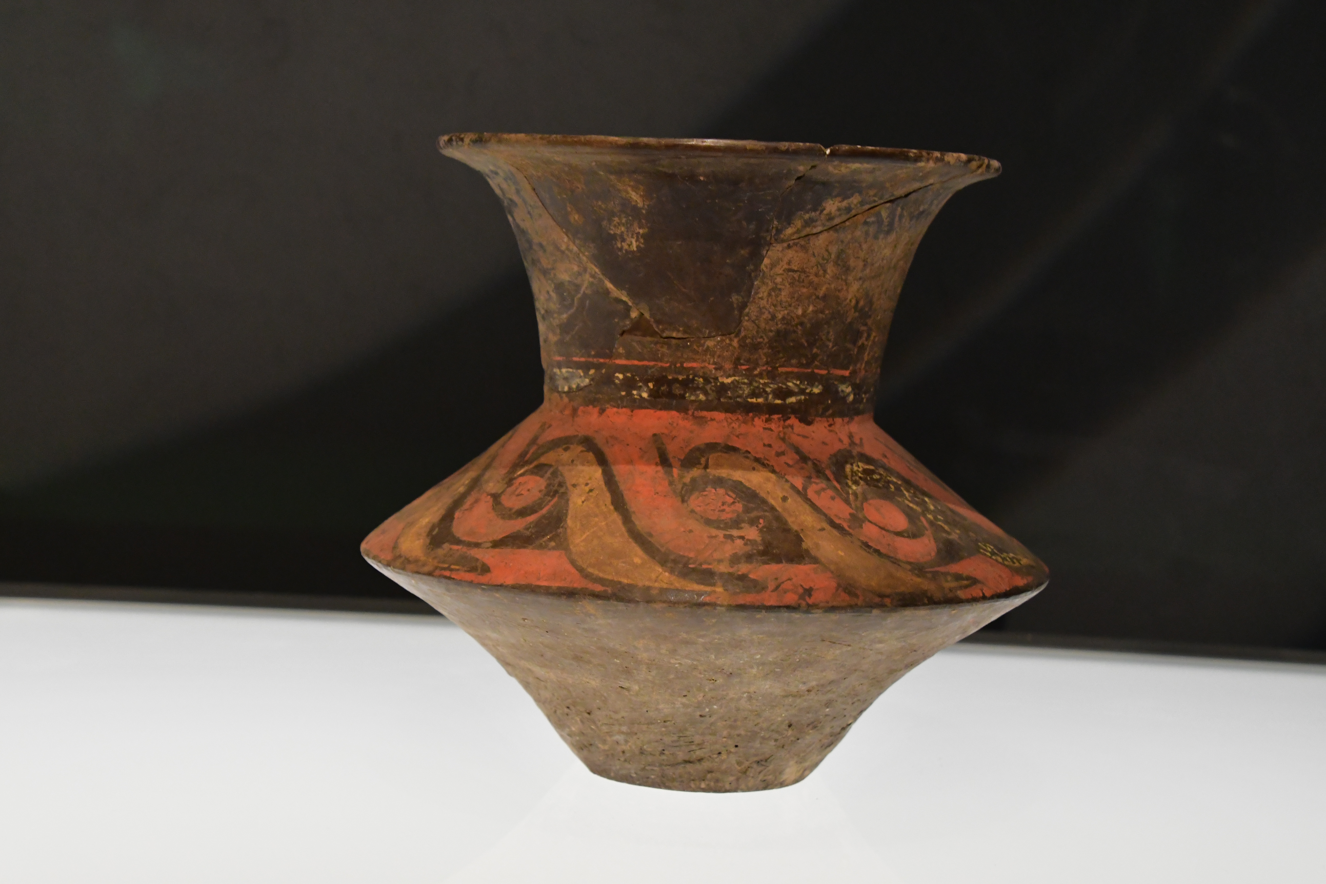 # 喇叭口, 斜折扇, 下腹部内收。器身施黑色陶衣, 并磨光。肩部用红、黄两色彩绘出勾状连涡纹。这两件彩绘陶壶出上于陶寺墓地最高等级墓葬之中, 出上时并列放置, 位于墓圹右侧。部分彩绘陶壶发现壶口有苫盖麻布的痕迹, 据此被认为是用来装酒。