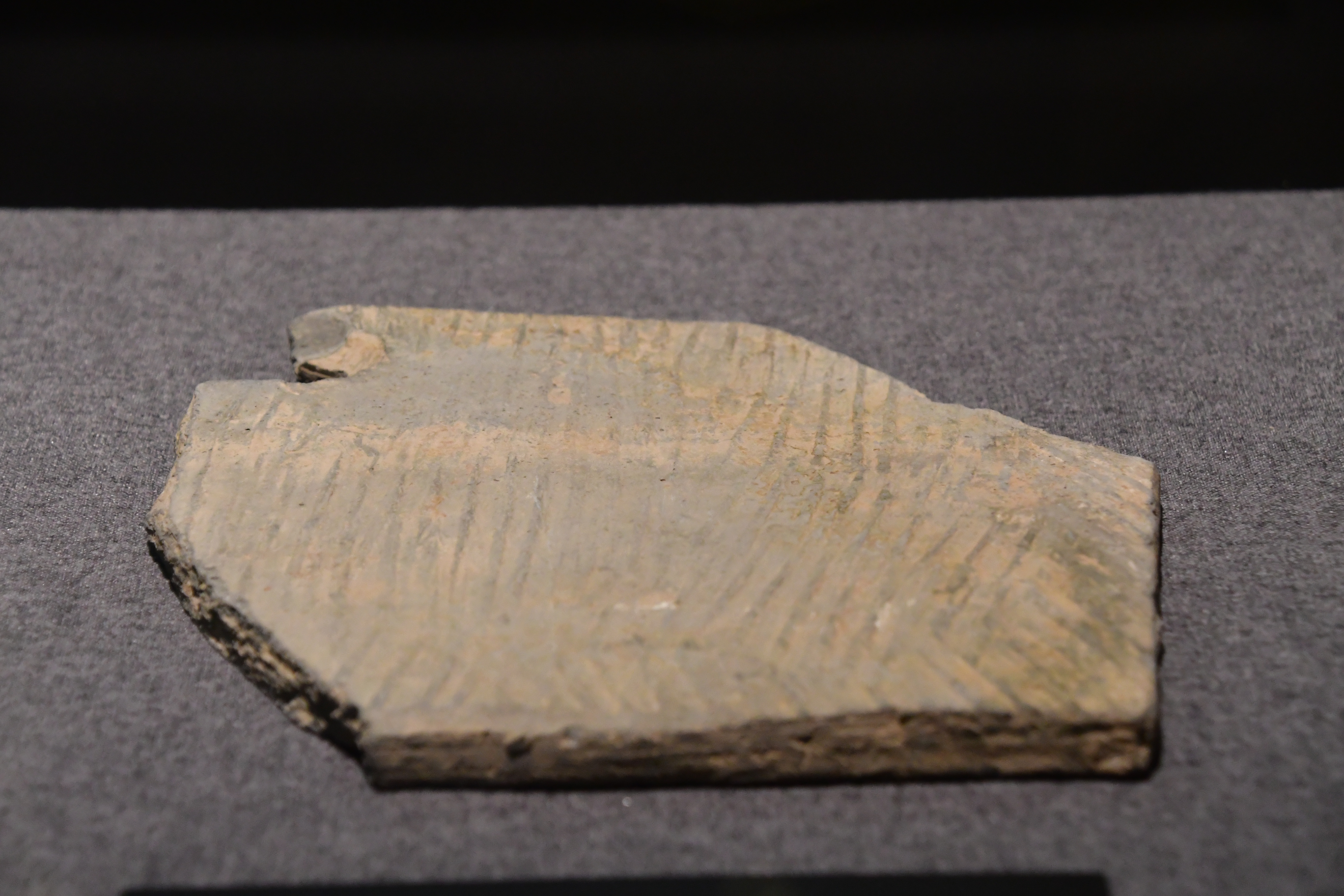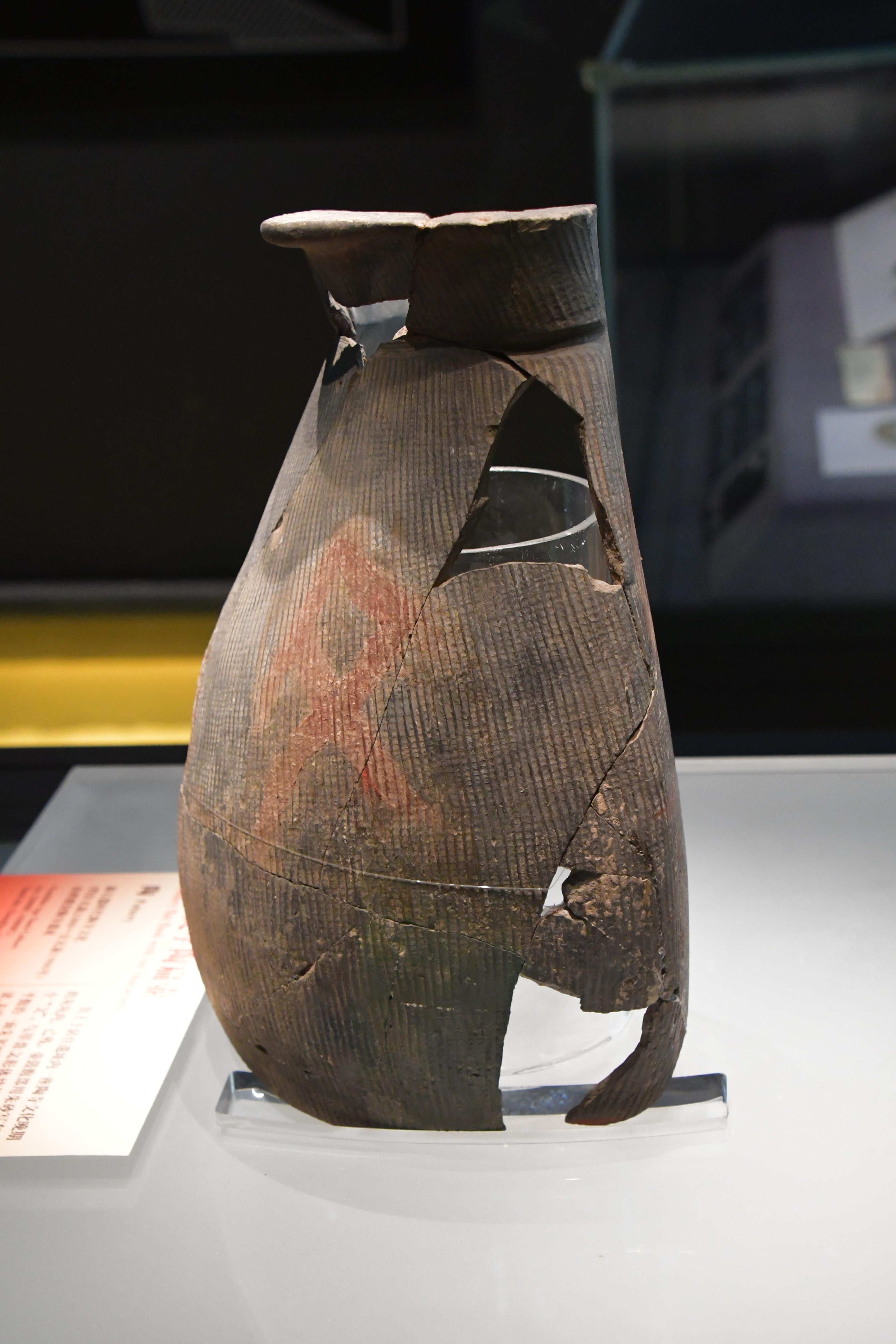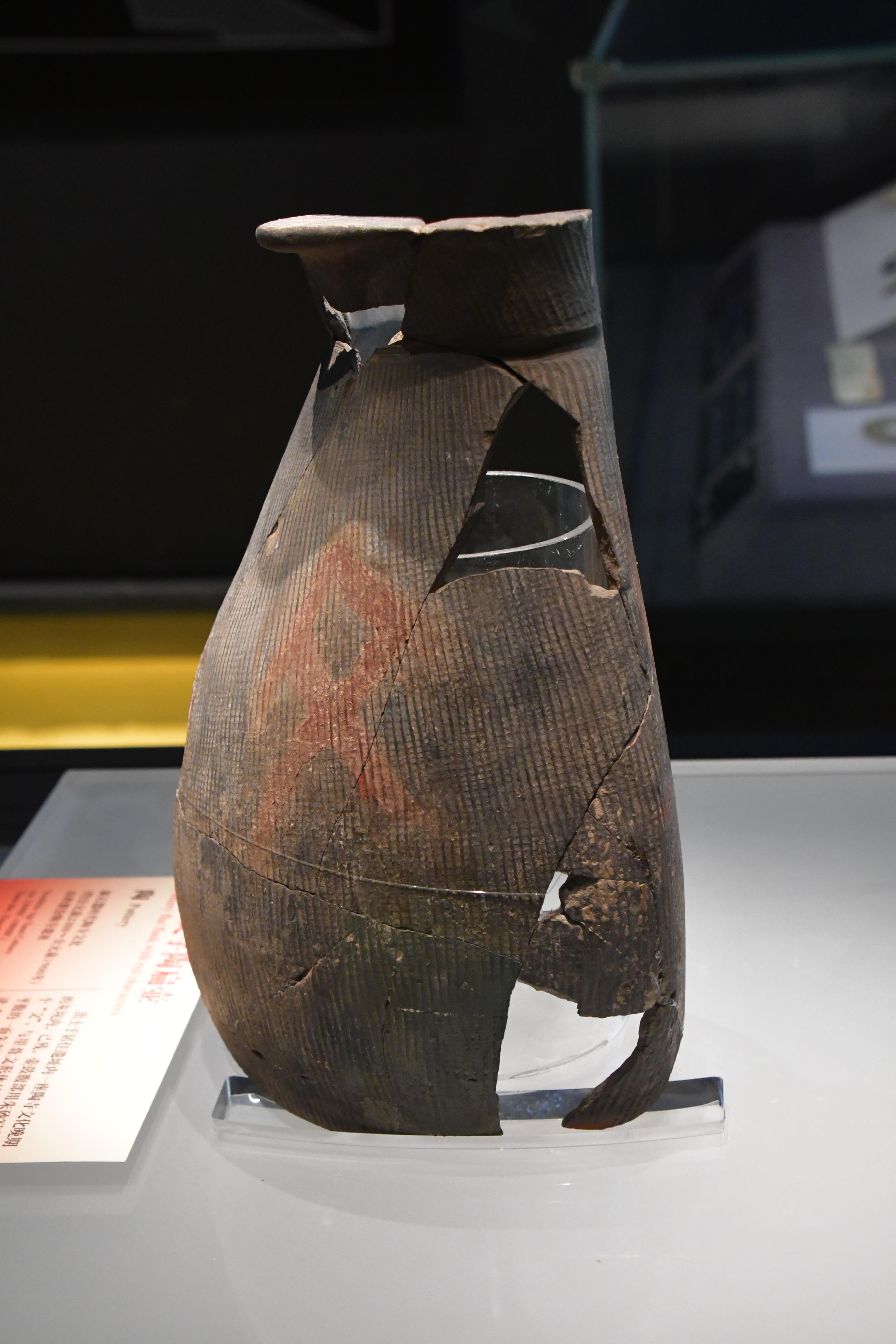 거주유적지의 한 곳인 도사문화말기의 회갱에서 출토되였는데 이미 파손되었다. 호(壺)의 튀어나온 복부에 주사로 "文"자를 썼는데, 갑골문 형체 구조와 매우 비슷하다. 평평한 복부의 한면에도 주사로 쓴 2개의 문자가 있는데 아직 어떤 글자인지 알아내지 못했다. 어떤 학자는 "堯"라고 생각하고, 어떤 학자는 "邑"이라고 생각하며, 또 어떤 학자는 "唐"이라고 생각한다. 파손된 곳을 따라 한바퀴 붉은색이 칠해져 있는데, 주서를 쓸 때 이 호(壺)가 이미 파손되었음을 나타낸다. 붓끝을 들고 누르는 것이 뚜렷하여 쓰는 도구가 붓이어야 한다고 추측한다.