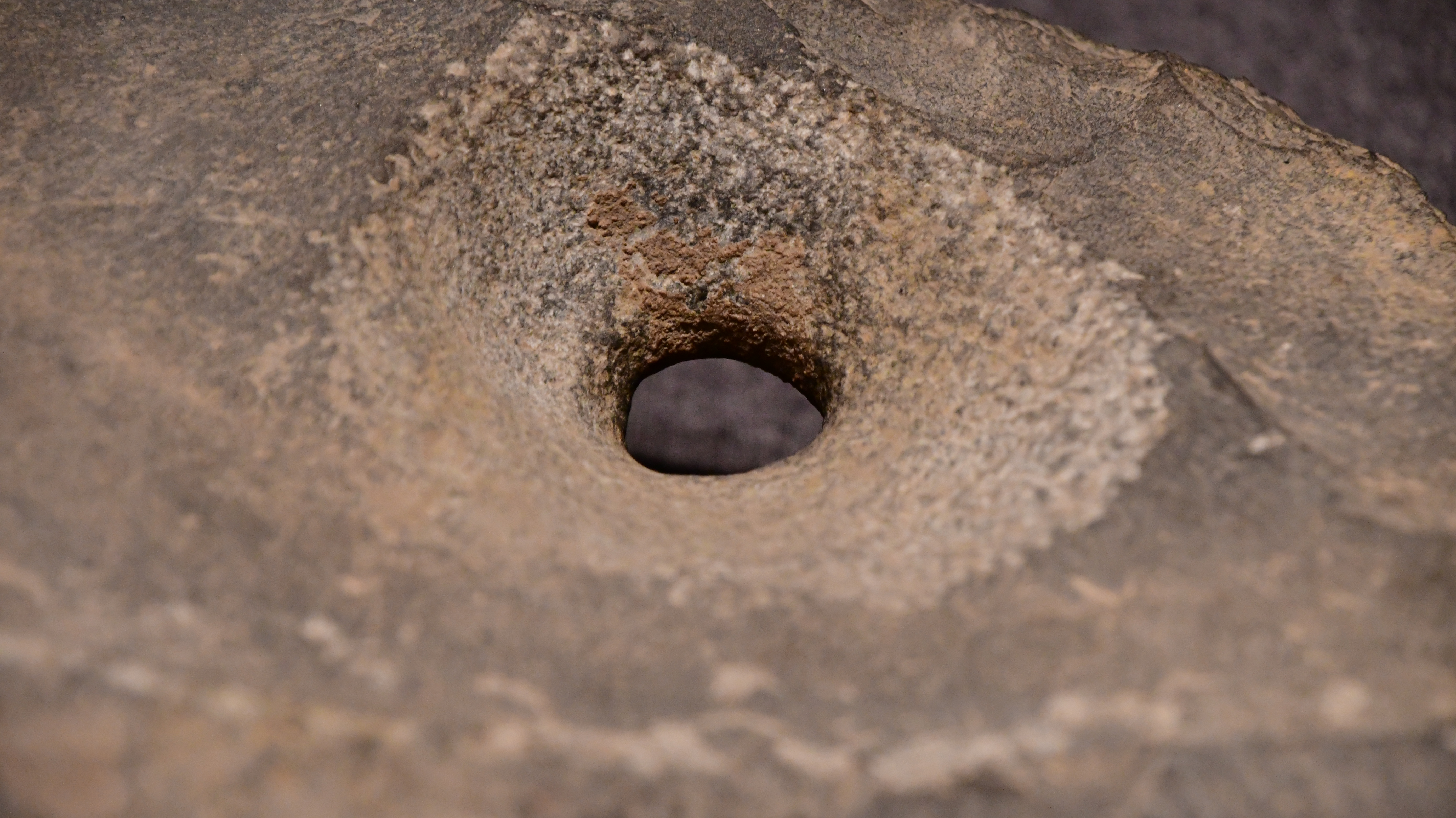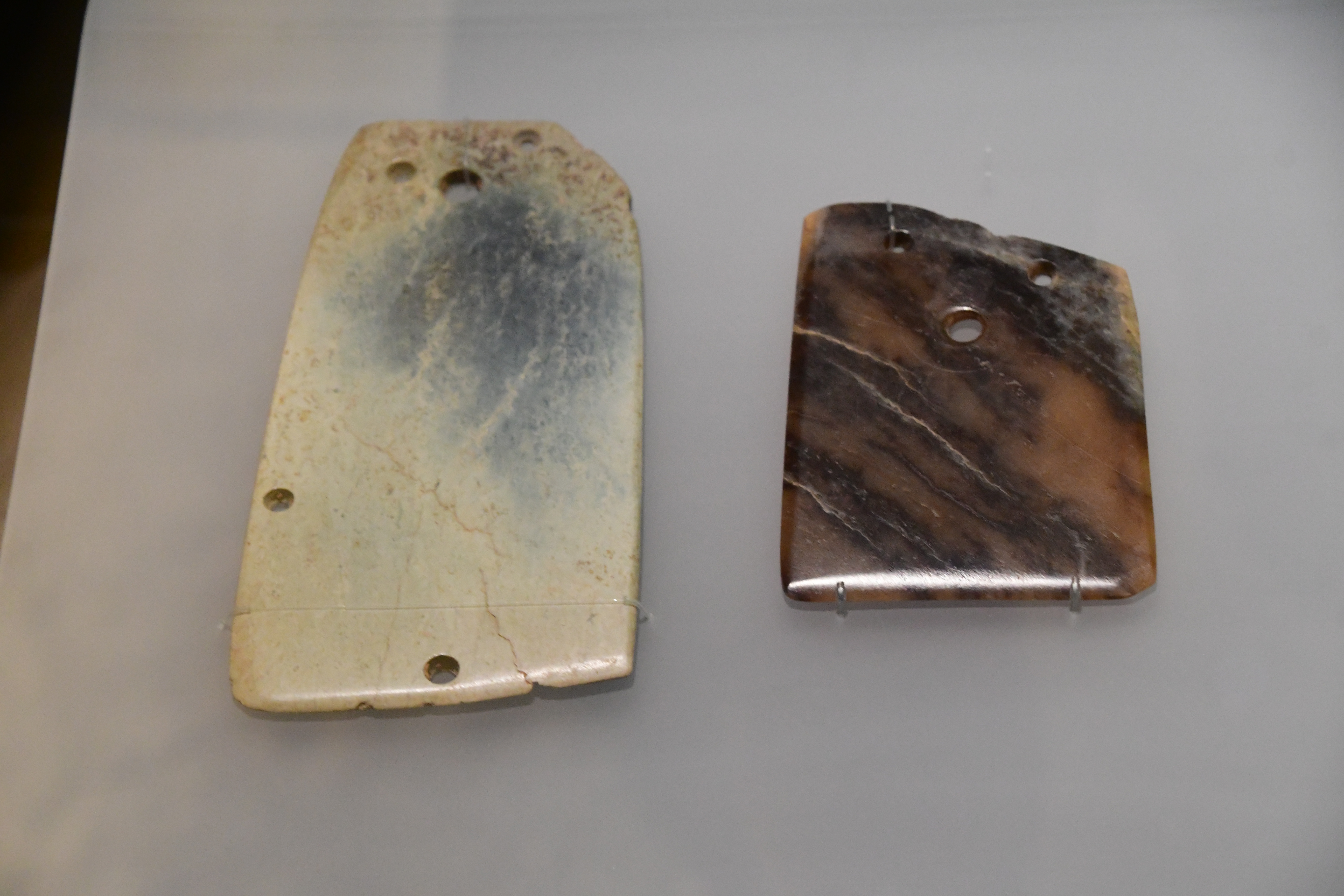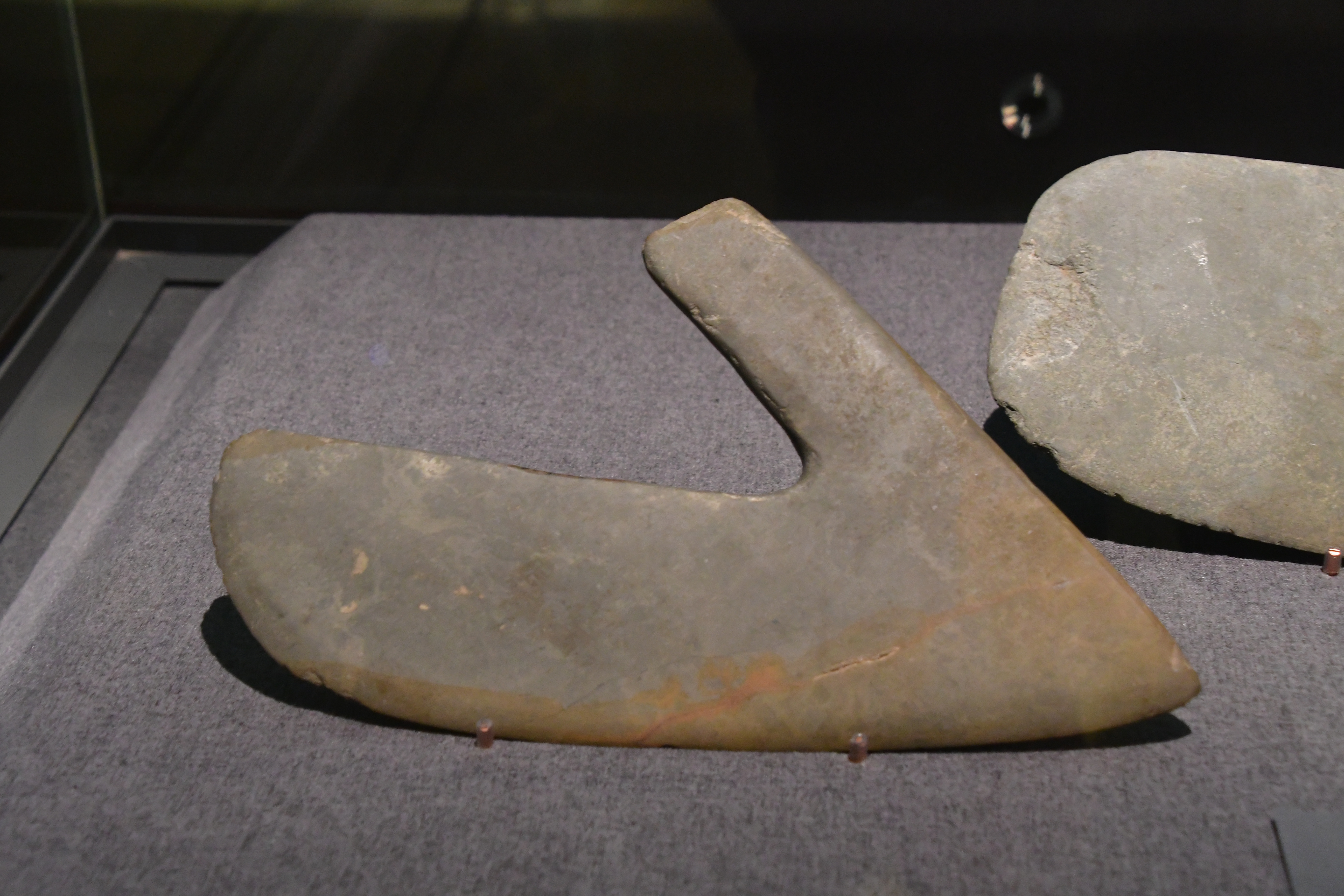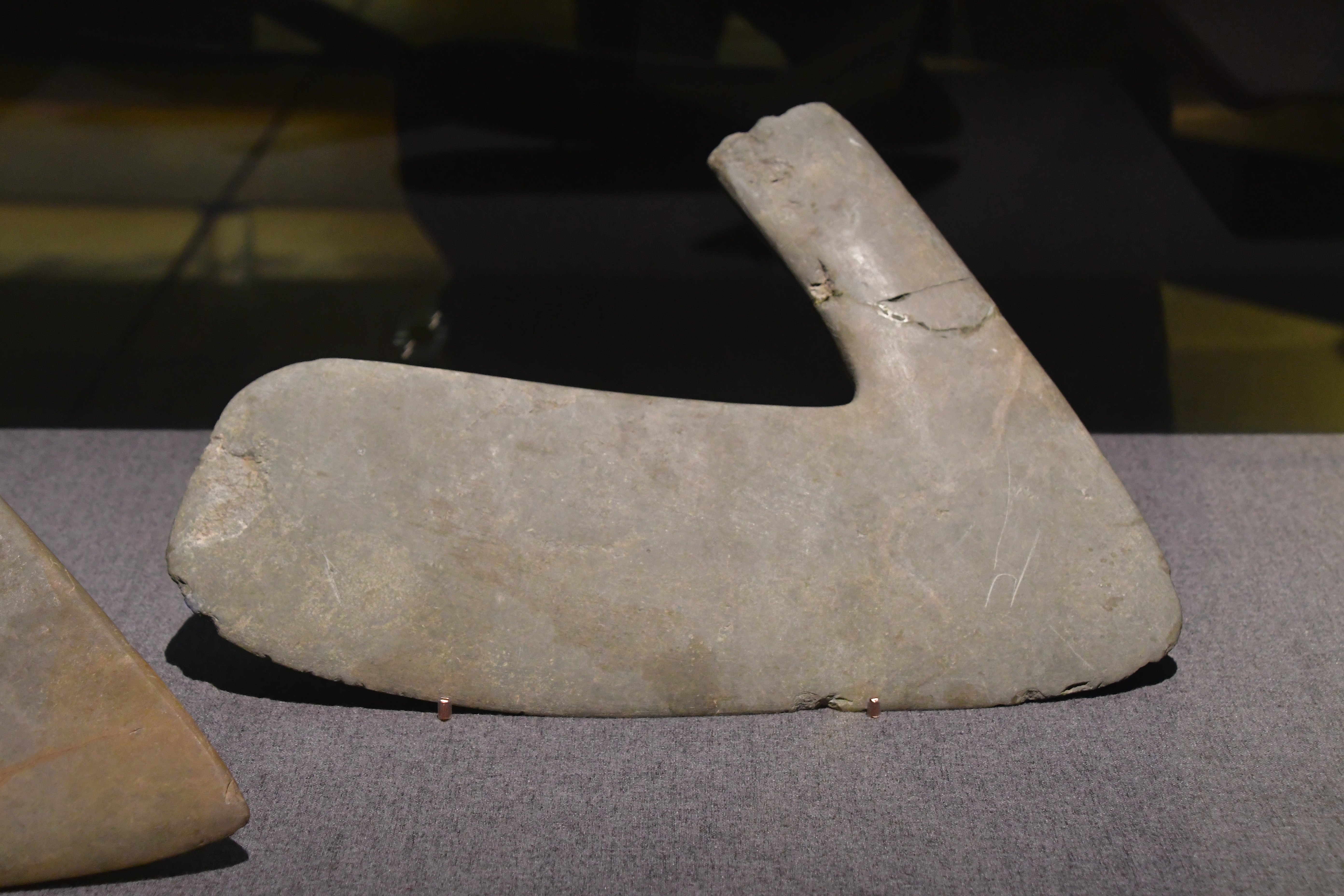 # 青灰色角岩打制成型, 经过琢修。呈不规则多边形, 股短阔, 鼓狭长。股鼓相交形成约为160度的夹角, 据句下方对钻一个悬孔, 孔内有绳索磨痕,显然是长期使用过。