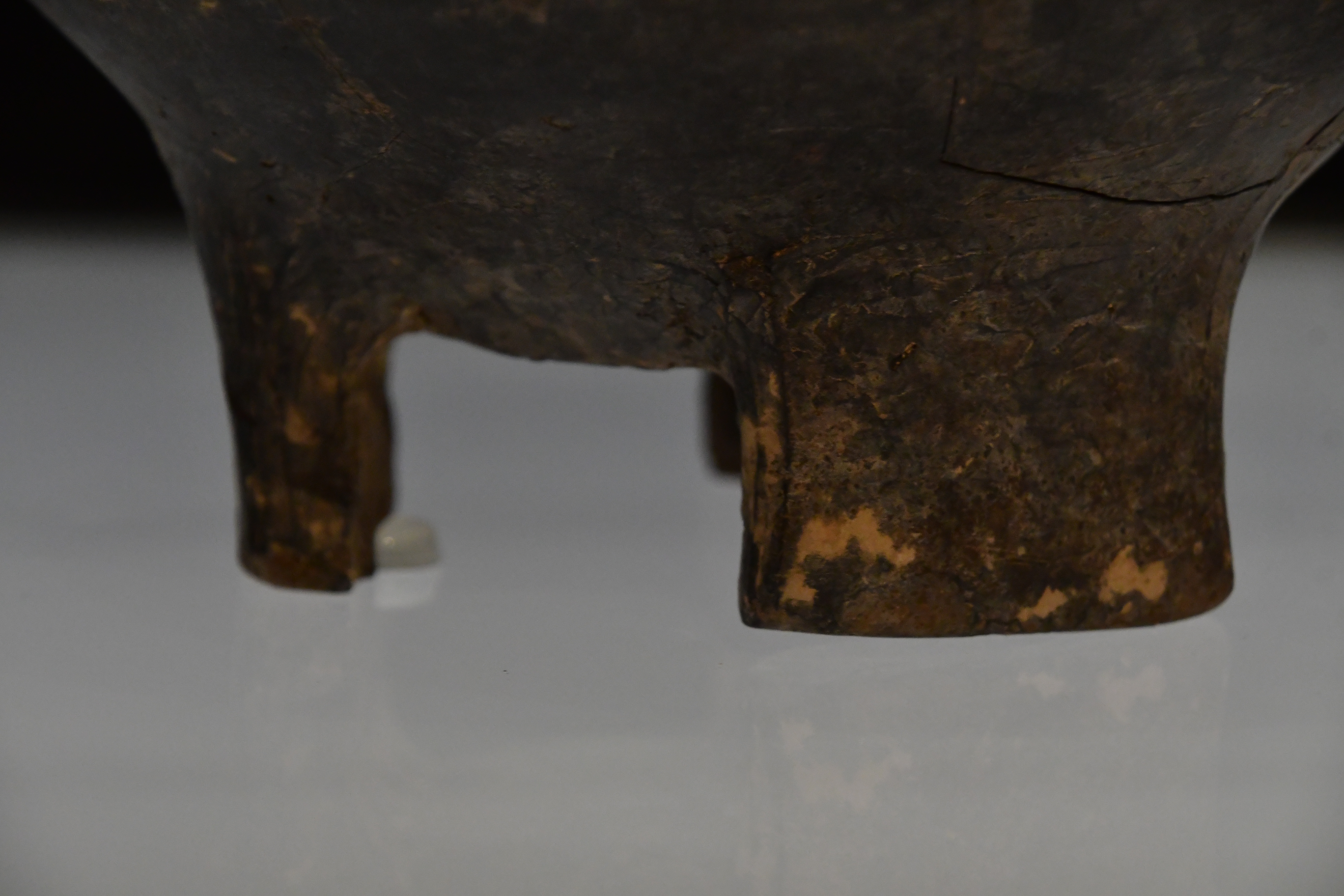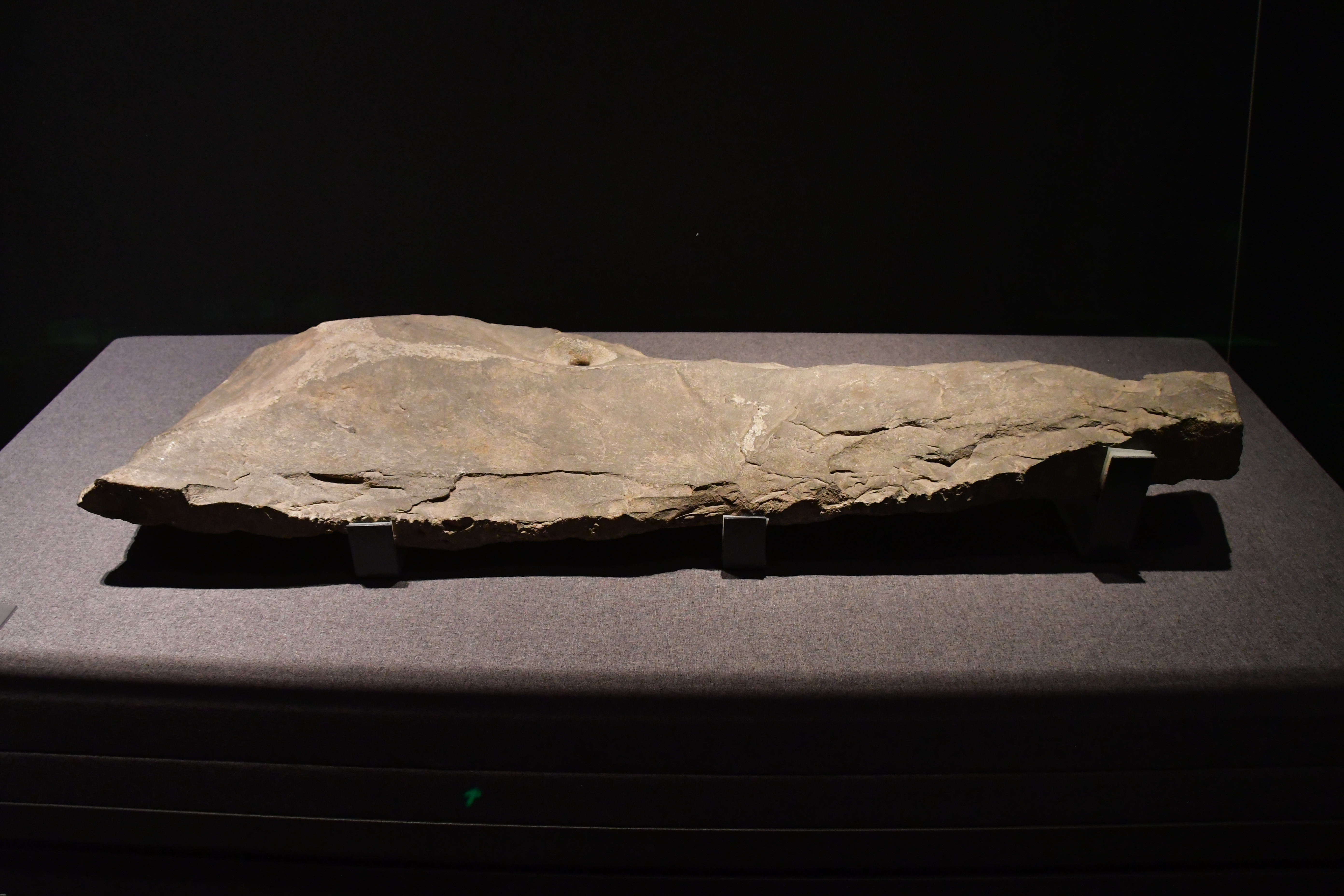 # 청회색의 모난 바위를 쪼개서 모양을 만들고 다듬었다. 불규칙한 다각형을 띠고 있으며 다리가 짧고 넓으며 폭이 좁으면서 길다. 다리와 북이 교차하여 약 160도의 협각을 형성하였는데, 구(句) 아래에 구멍을 뚫은 것에 근거할 때 구멍 안에 밧줄이 닳은 흔적이 있어 분명히 장기간 사용한 적이 있다.
