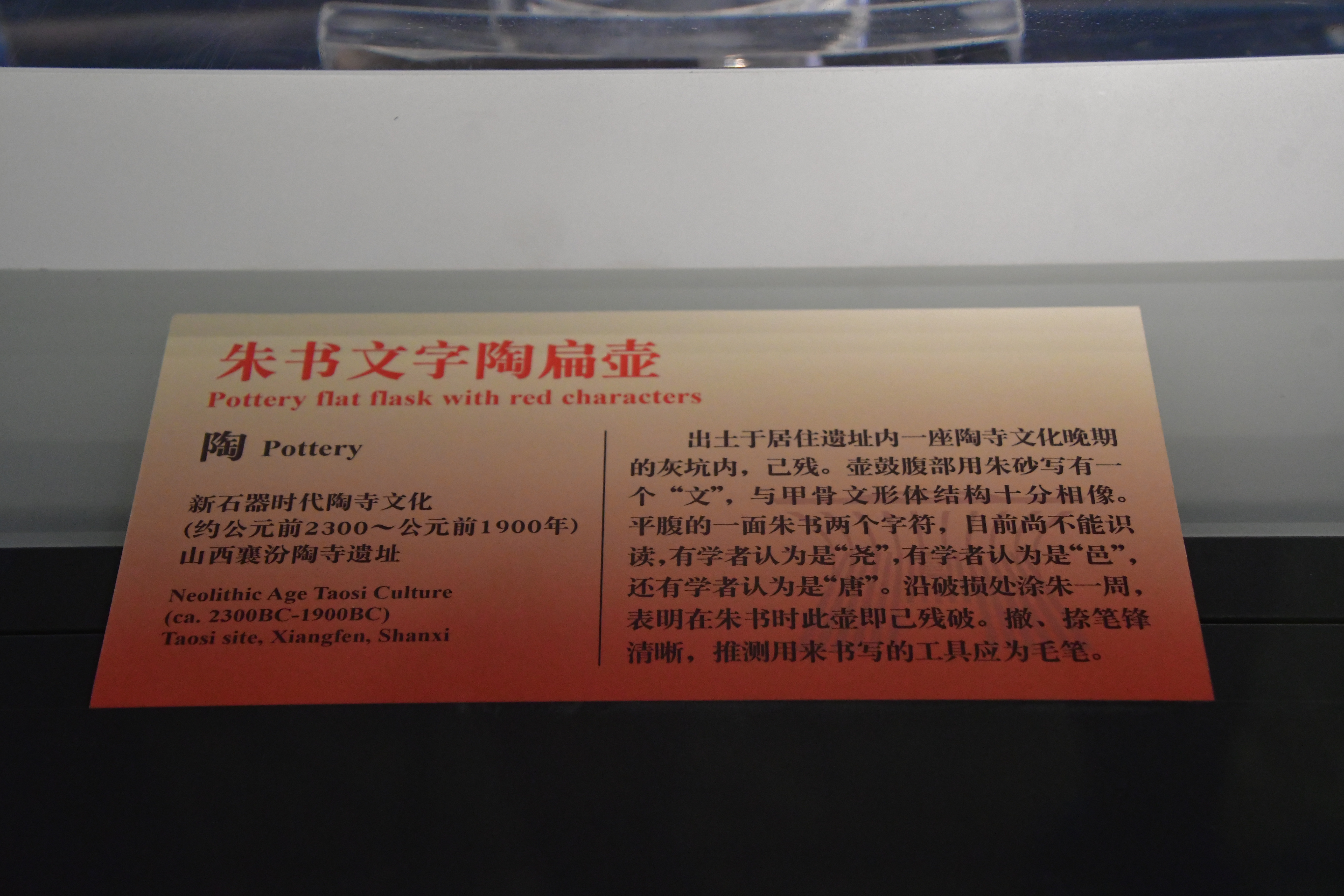 出土于居住遗址内一座陶寺文化晚期的灰坑内, 已残。壶鼓腹部用朱砂写有一个“文”, 与甲骨文形体结构十分相像。 平腹的一面朱书两个字符, 目前尚不能识读, 有学者认为是“尧”, 有学者认为是“邑”, 还有学者认为是“唐”。沿破损处涂朱一周, 表明在朱书时此壶即已残破。撤、捺笔锋清晰, 推测用来书写的工具应为毛笔。