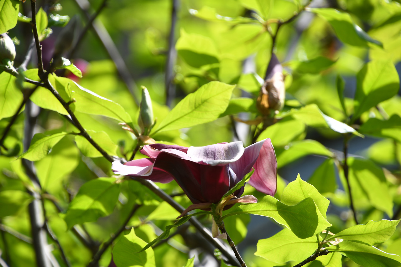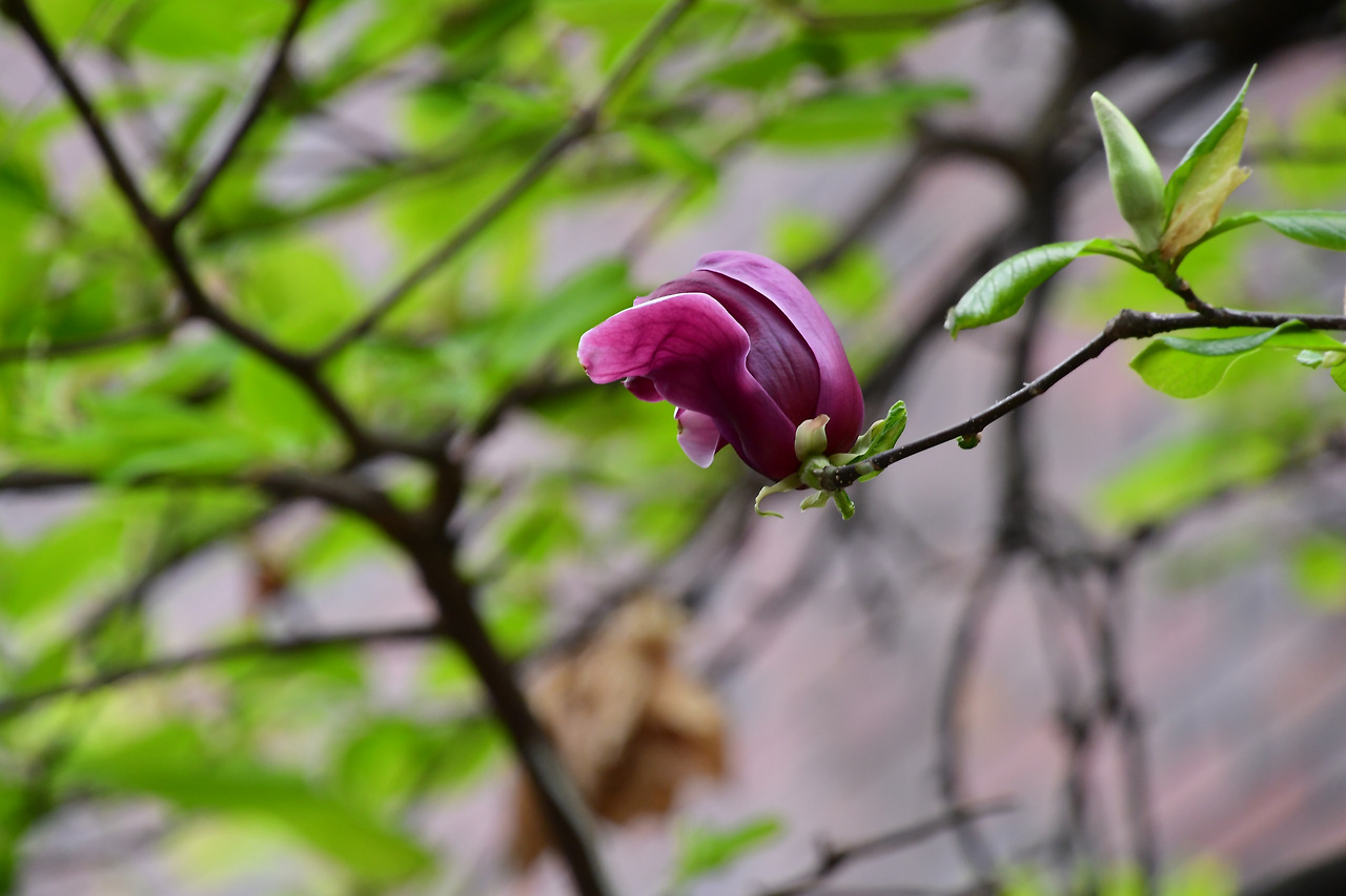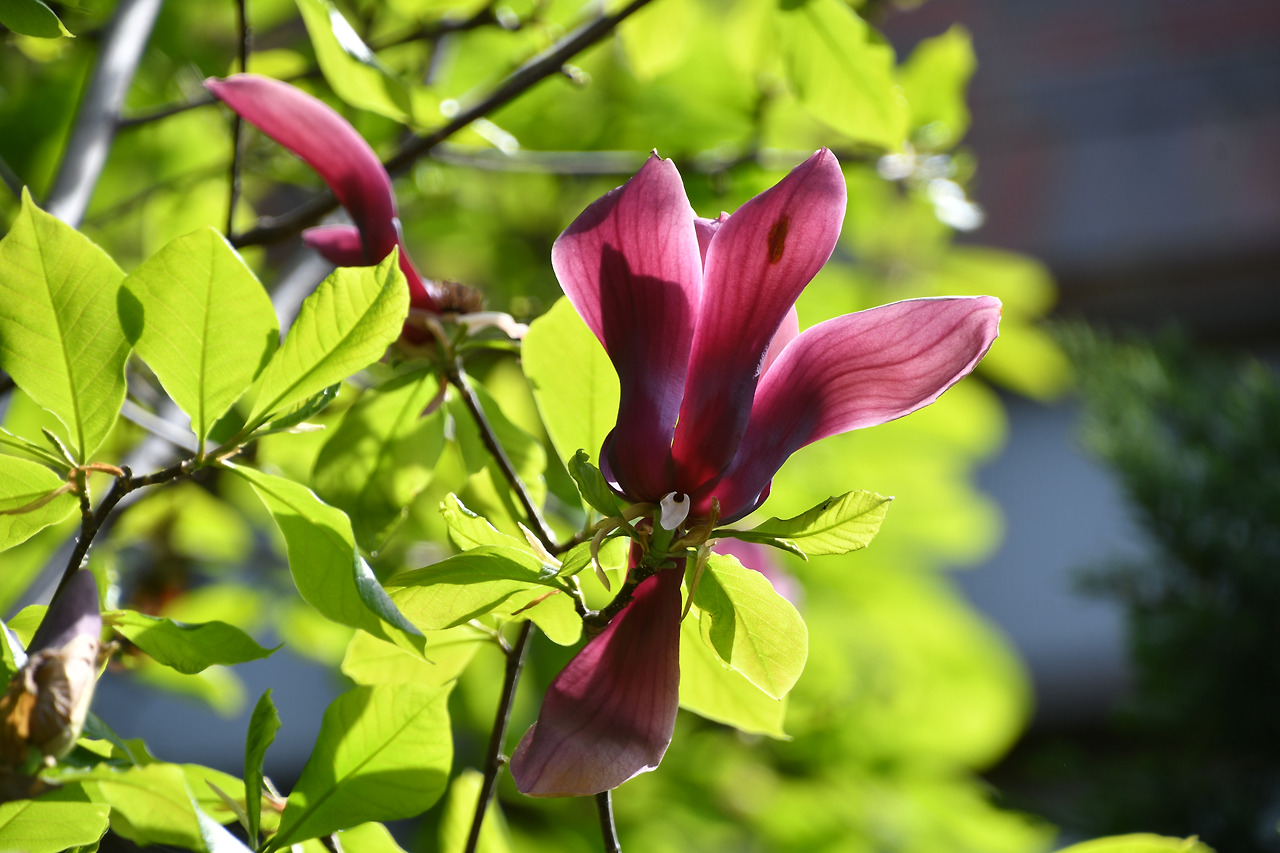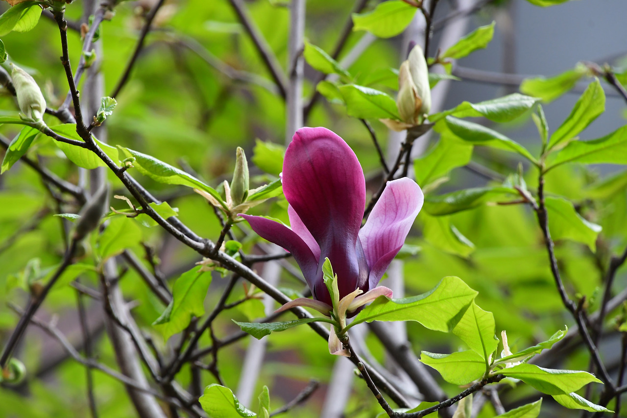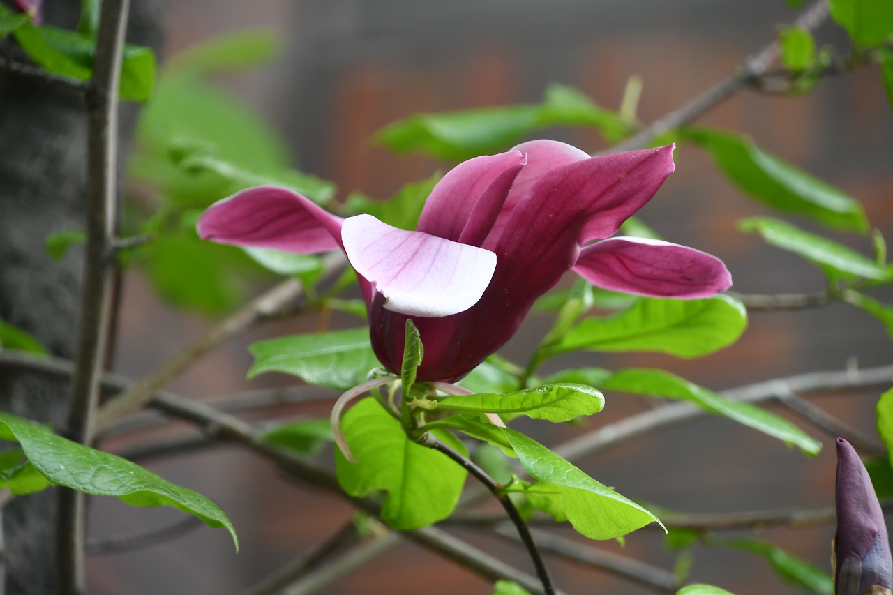 이 자목련은 꽃잎의 앞뒤가 모두 자주색이다. 보통은 겉은 자주색이고 속은 하얀색이다.