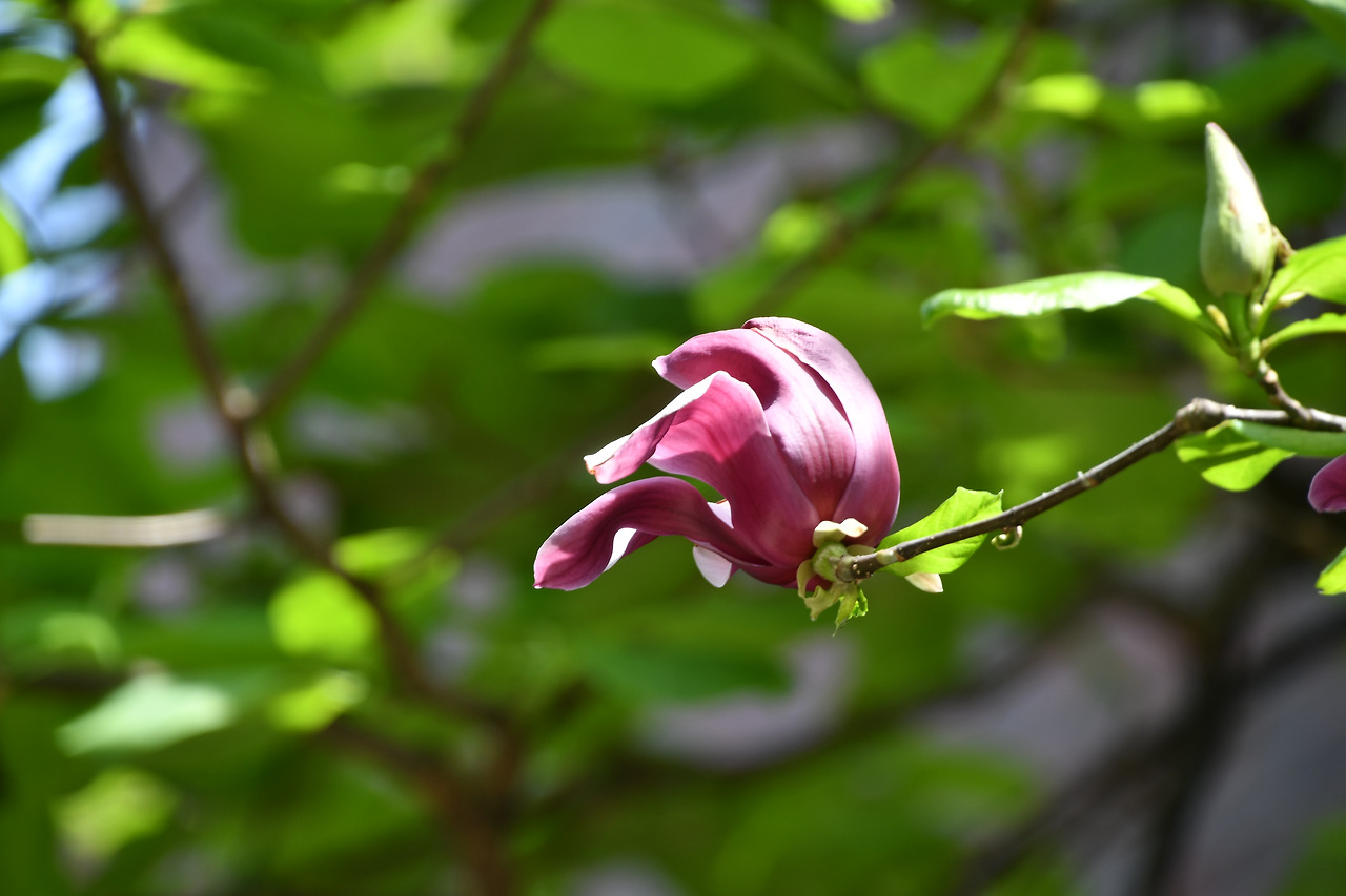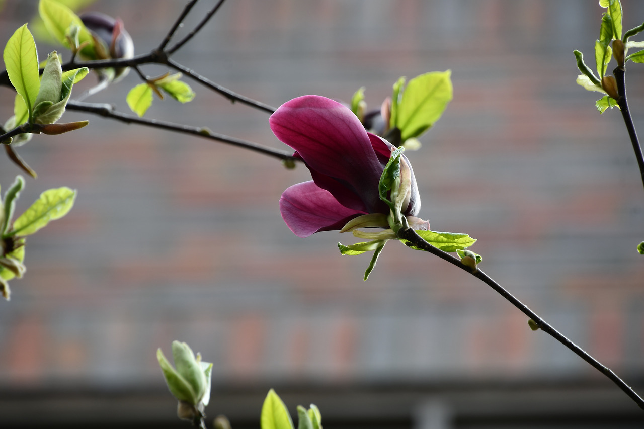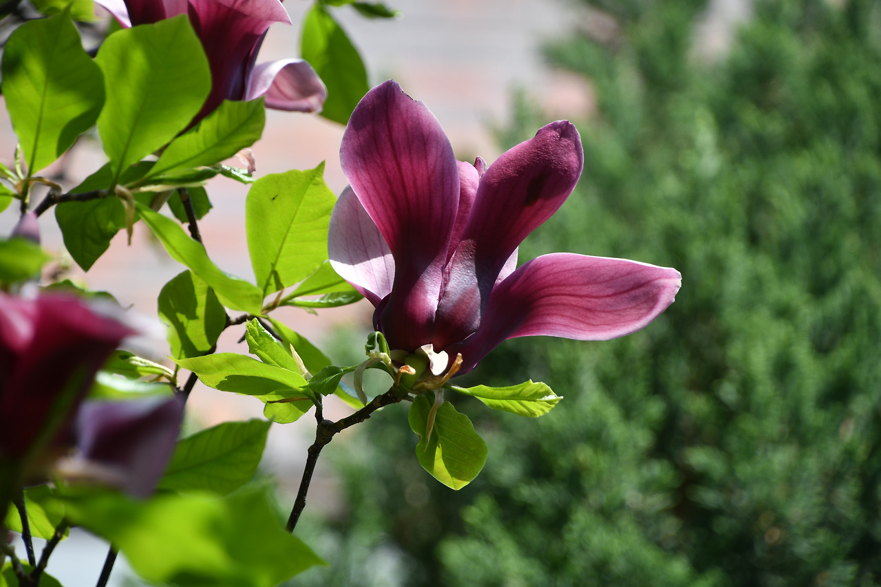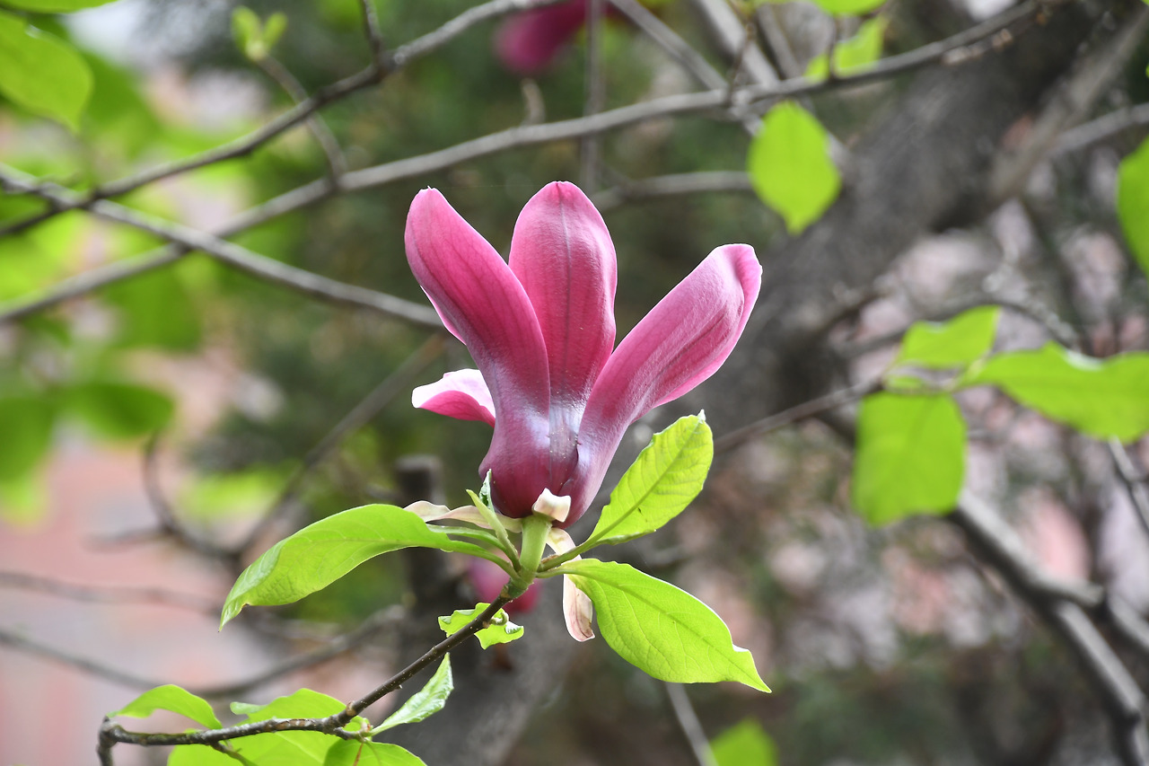 이 자목련은 꽃잎의 앞뒤가 모두 자주색이다. 보통은 겉은 자주색이고 속은 하얀색이다.