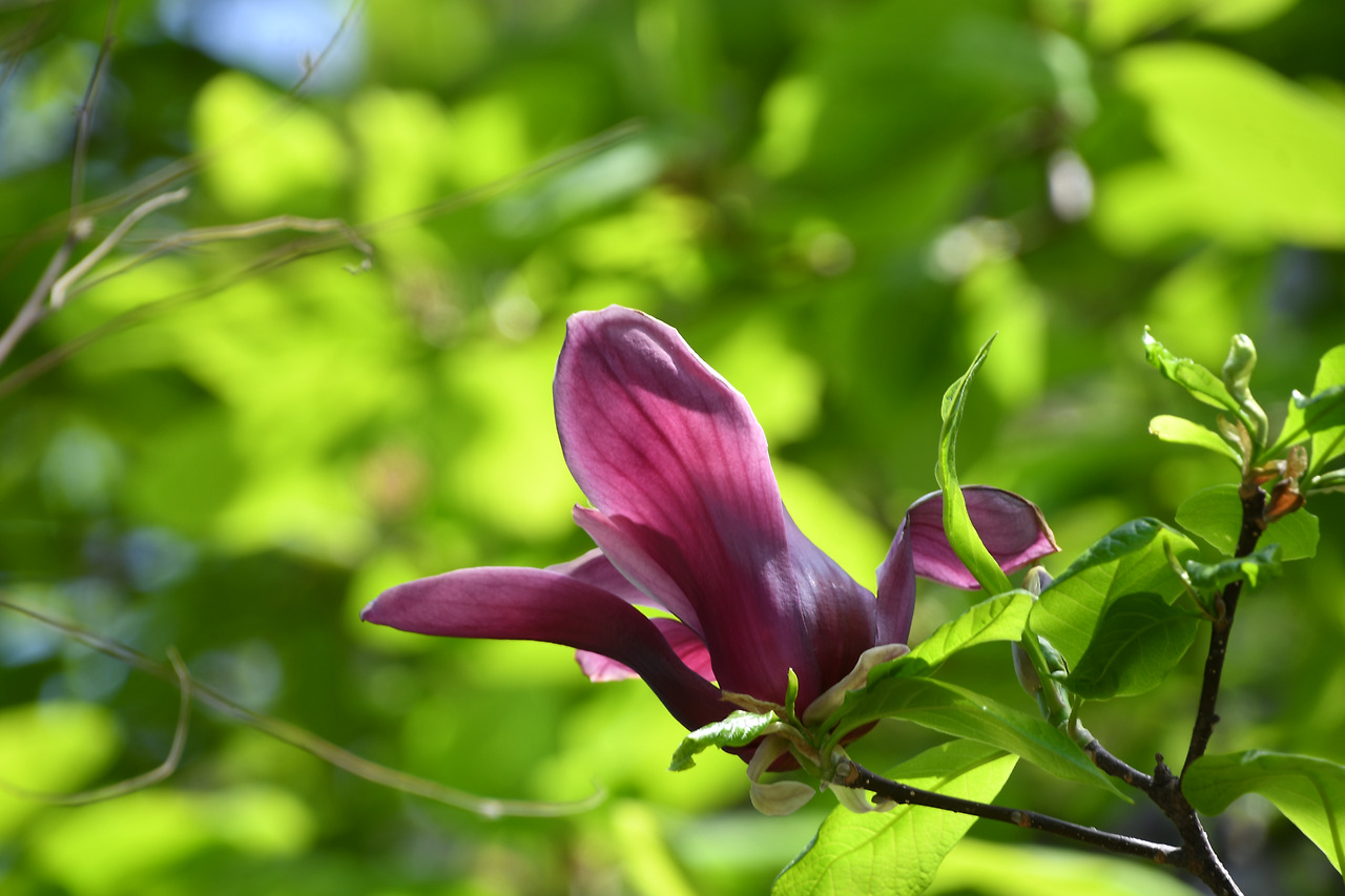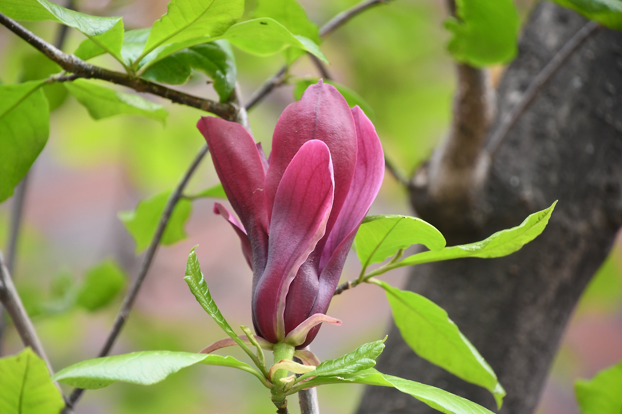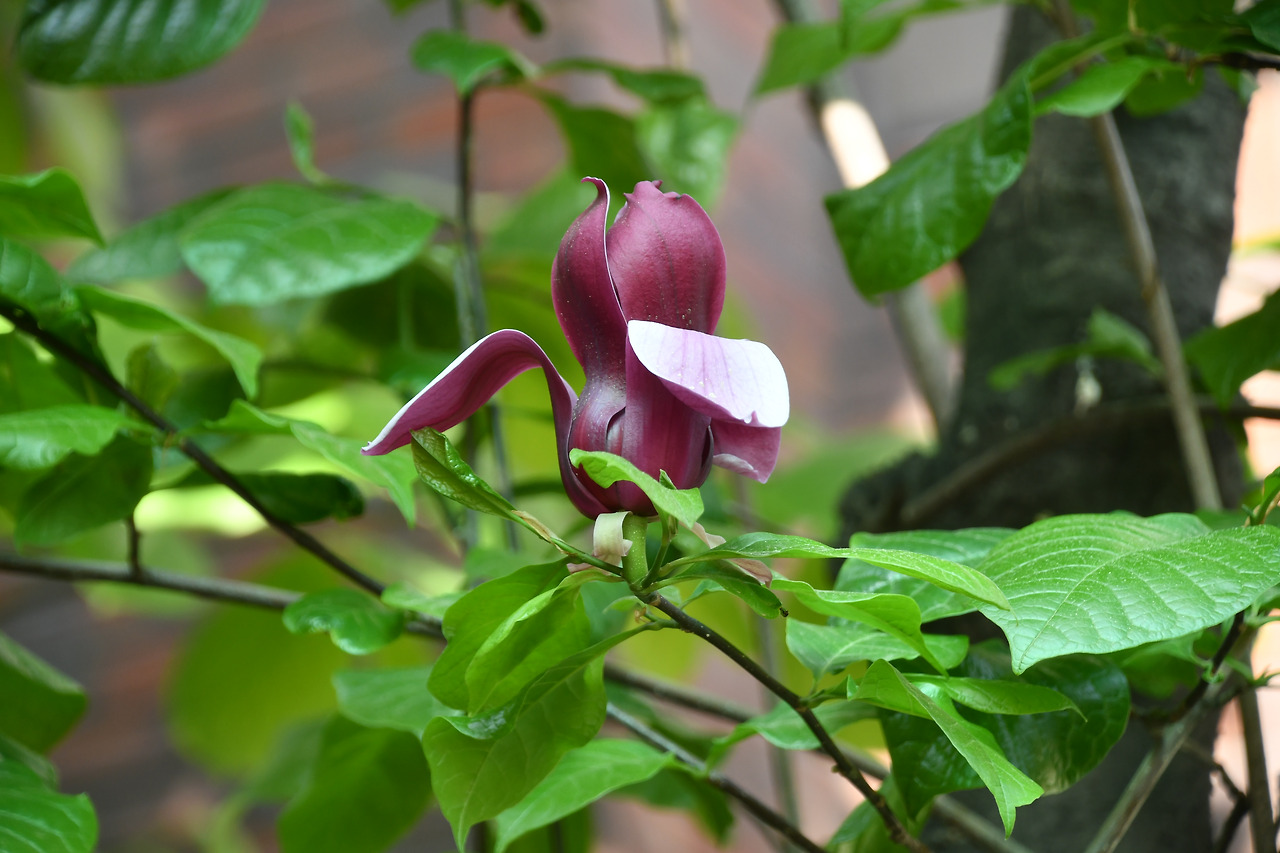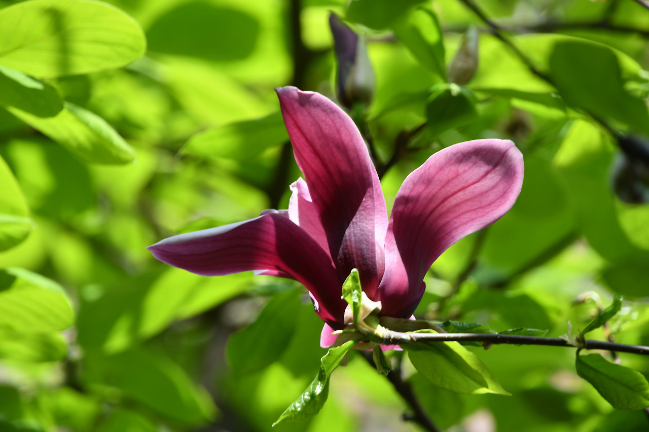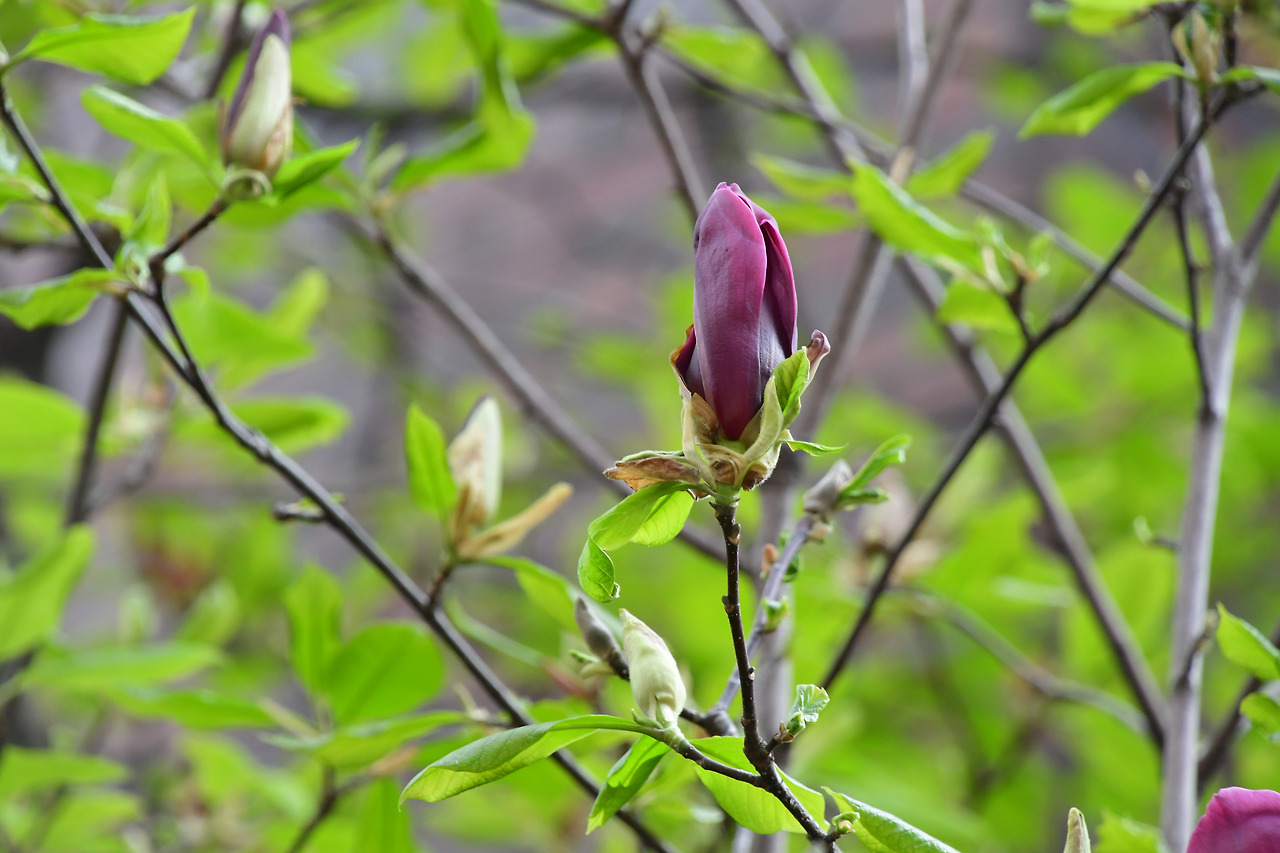 이 자목련은 꽃잎의 앞뒤가 모두 자주색이다. 보통은 겉은 자주색이고 속은 하얀색이다.