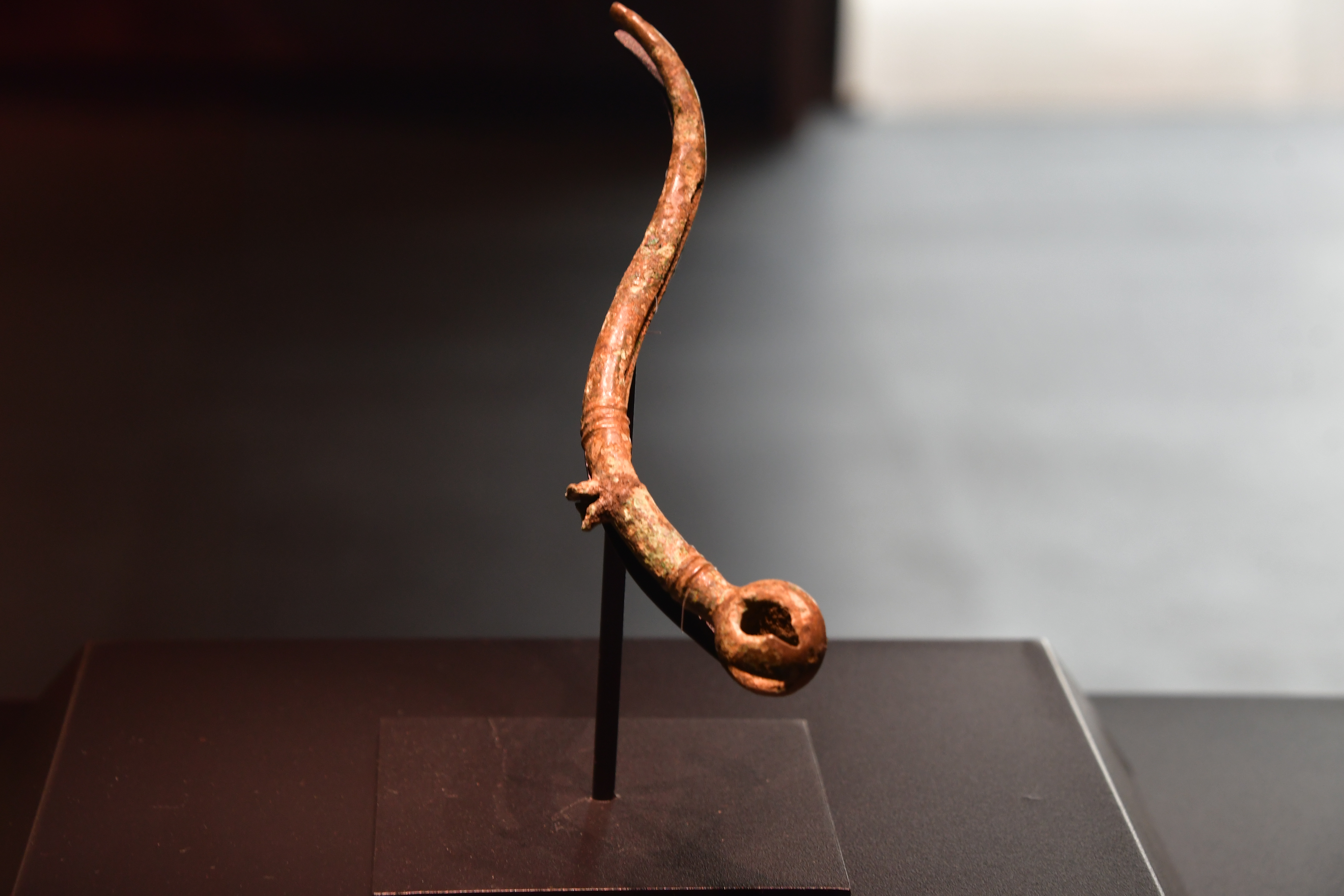 该器物整体呈曲波形,尖部呈锥状,尾端接一圆形铃,具有草原青铜文化特征。有研究认为其与功用类似,也称其为領首錐狀器 。