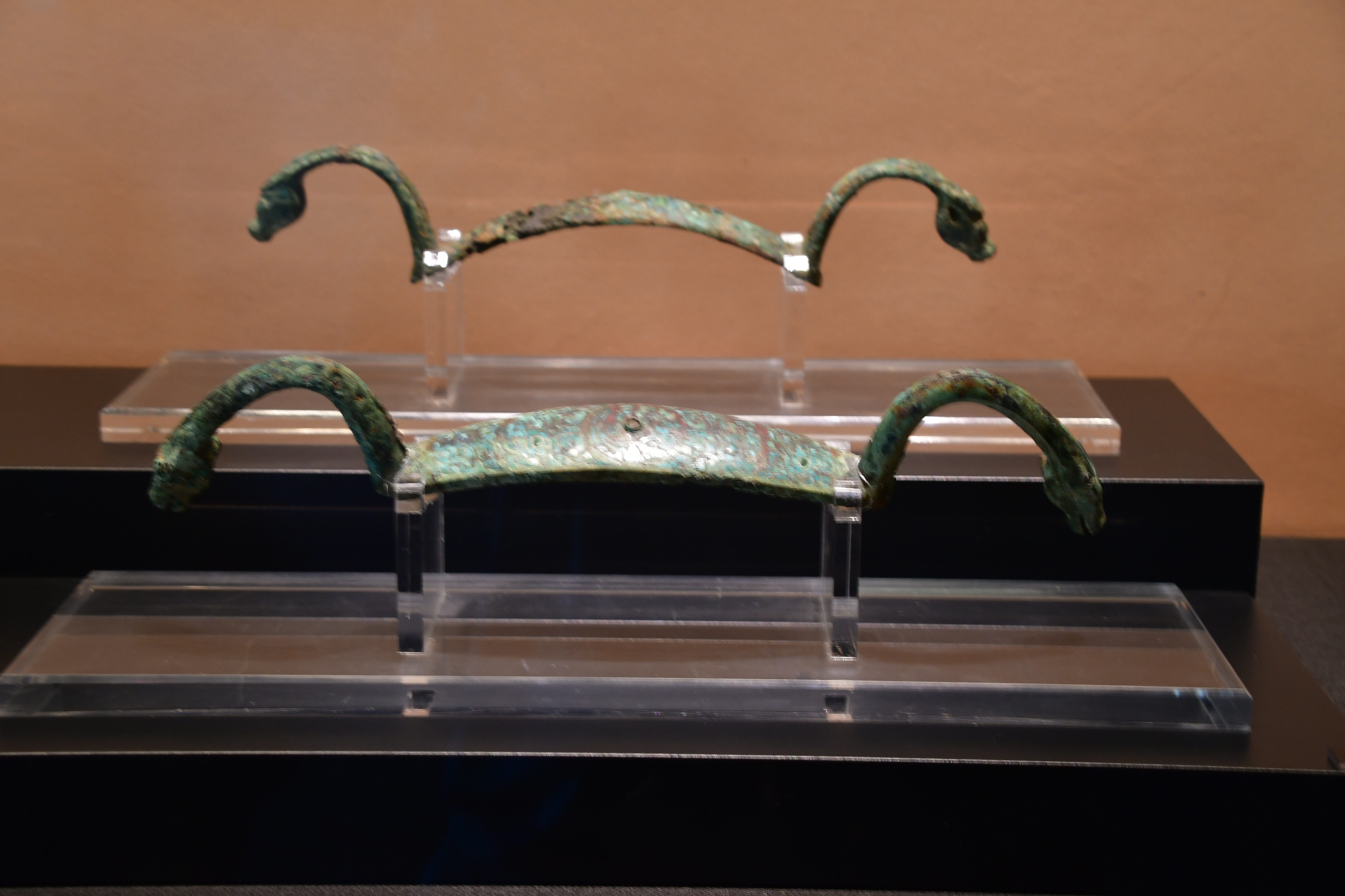 弓形器, 因形状如弓而得名。其用途主要有两种观点: 一种认为与弓有关; 另一种认为是与马车有关的“挂缰钩”。 弓形器在商代后期至西周早中期的墓葬和车马坑中多有发现。 亚长墓中的6件弓形器可能象征马车陪葬。