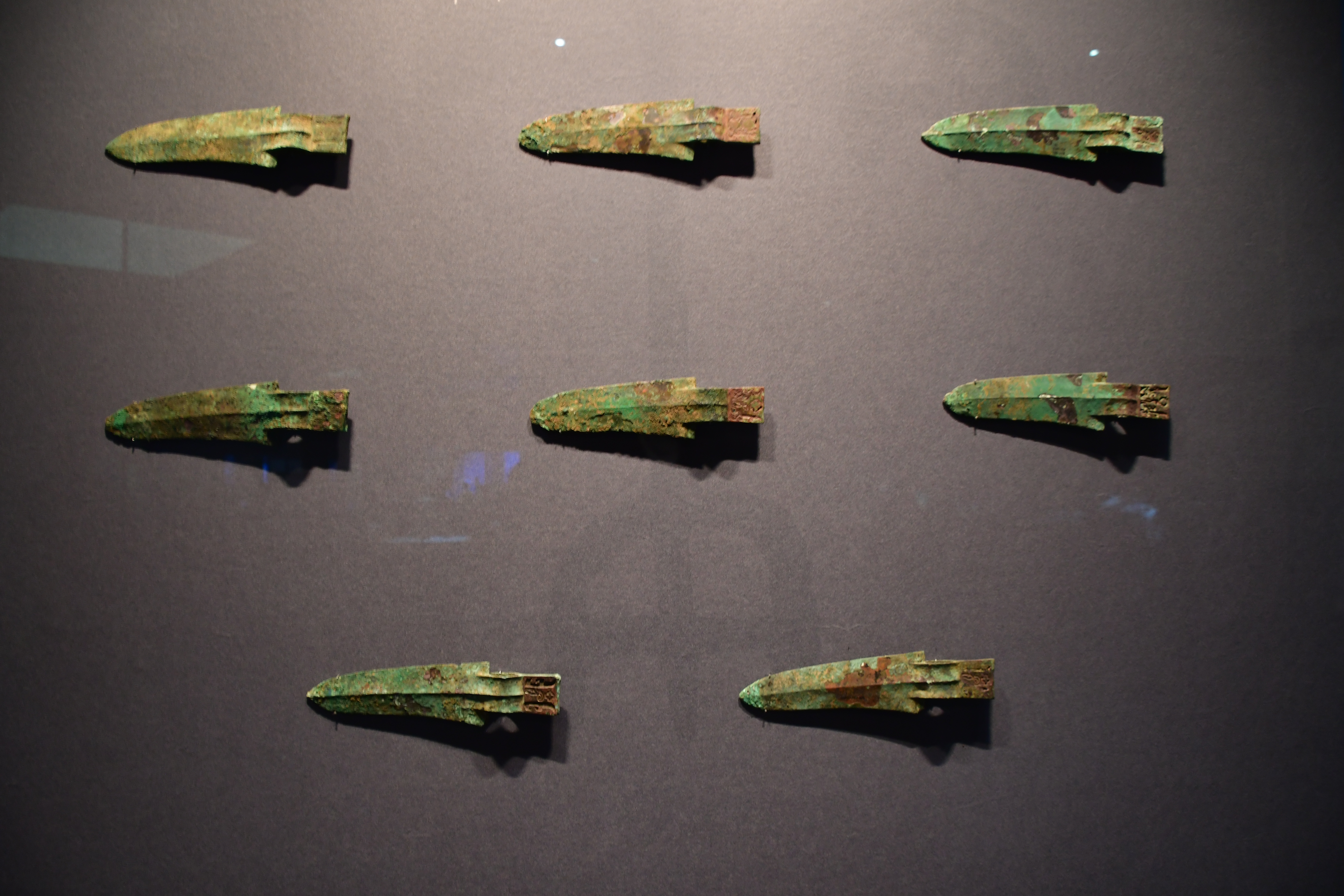 - 아장 무덤 속에서는 청동예기 40점이 출토되었는데, 9세트의 청동 고(觚)ㆍ작(爵)가 핵심을 이루며, 여기에 가(斝) ㆍ준(尊)ㆍ이(彝)ㆍ굉( 觥) ㆍ뢰(罍)ㆍ정(鼎)ㆍ궤(簋)ㆍ우(盂) 등이 있어, 아장이 생전에 높은 지위에 있었음을 나타낸다. 청동예기는 동일하게 정교하고 화려하며, 후중하고 단아하다. 대형 청동 방가(方斝) ㆍ방준(方尊)ㆍ우(盂)ㆍ언(甗) 등은 비록 1건씩만 있으나, 동등한 체량(體量)은 겨우 부호묘(婦好墓)에서나 보인다. 청동 우준(牛尊)ㆍ준(尊) 형태의 입이 넓은 방정(方鼎)ㆍ초족동굉(鐎足銅觥) 등은 은허에서 처음 발견되었다. 편요(編鐃)는 대형 석경과 함께 예약제도가 이미 성숙했음을 분명하게 보여준다.