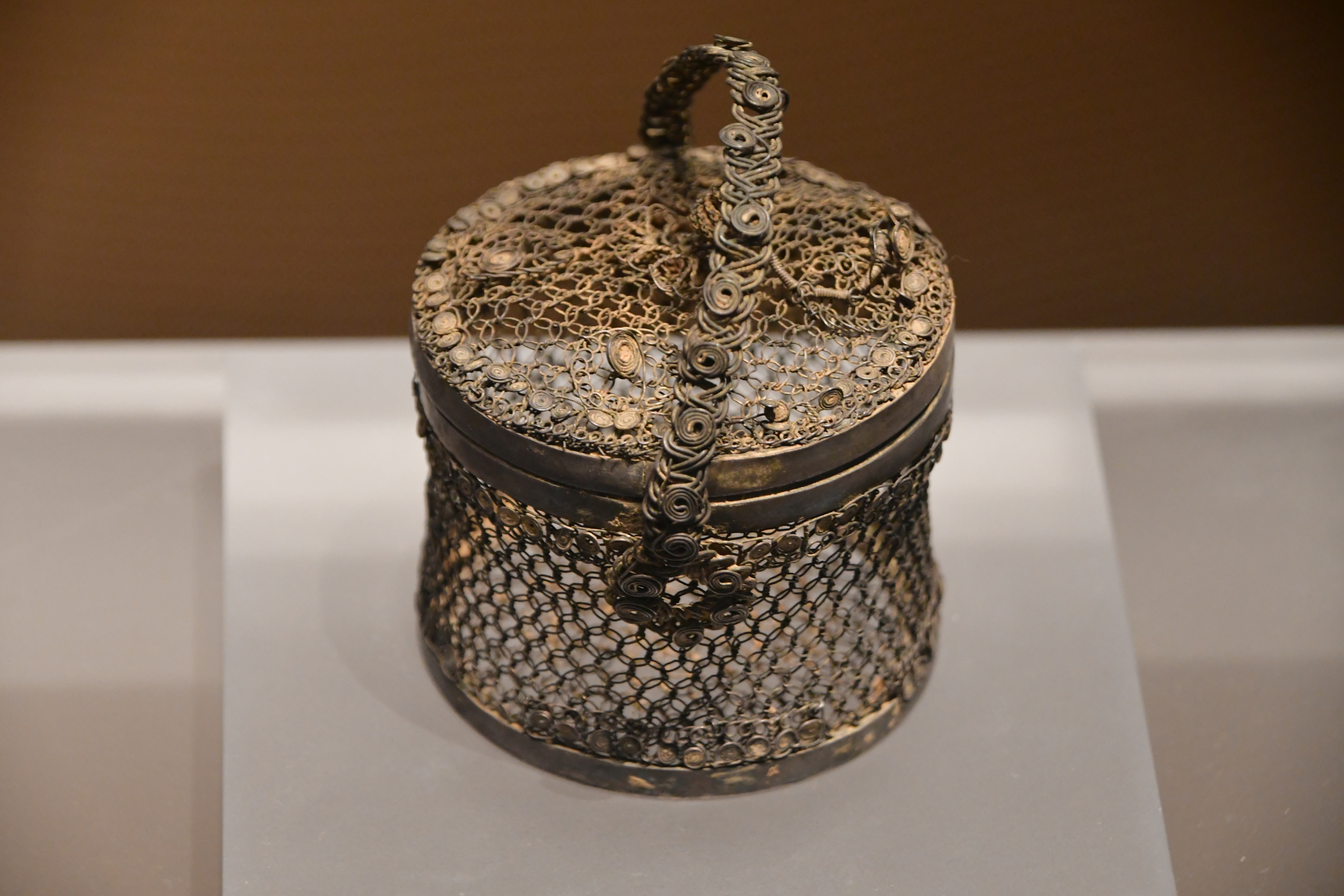 이 그릇[籠]은 찻잎을 담는 용기이다. 뚜껑, 손잡이, 그리고 몸통으로 구성되어 있으며, 모두 은실로 엮어 만들어졌다. 당나라 시대의 전형적인 유물로 매우 희귀하다. 현재까지 이와 유사한 금실과 은실로 엮인 손잡이가 달린 그릇은 법문사 지하궁전에서만 발견되었다.