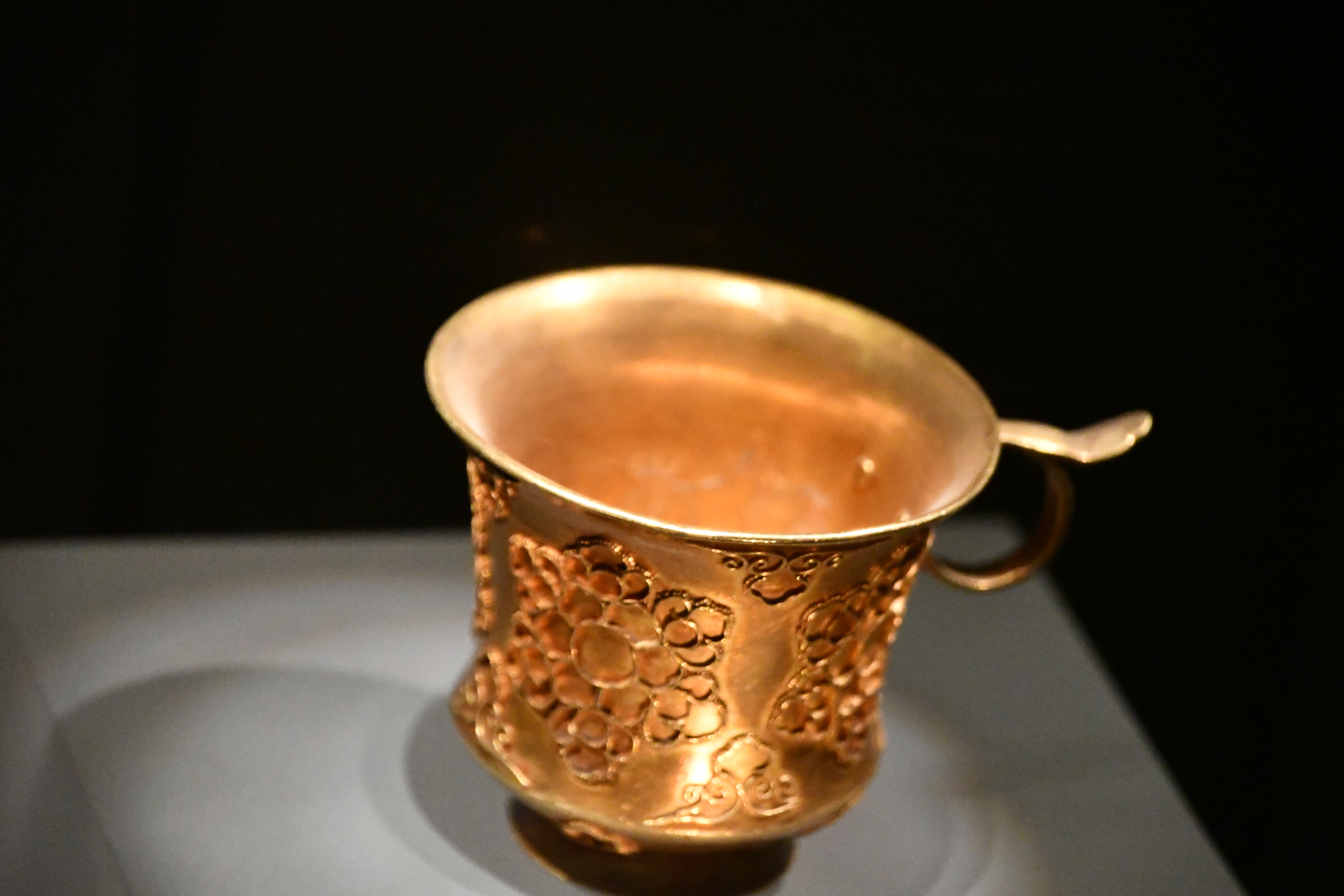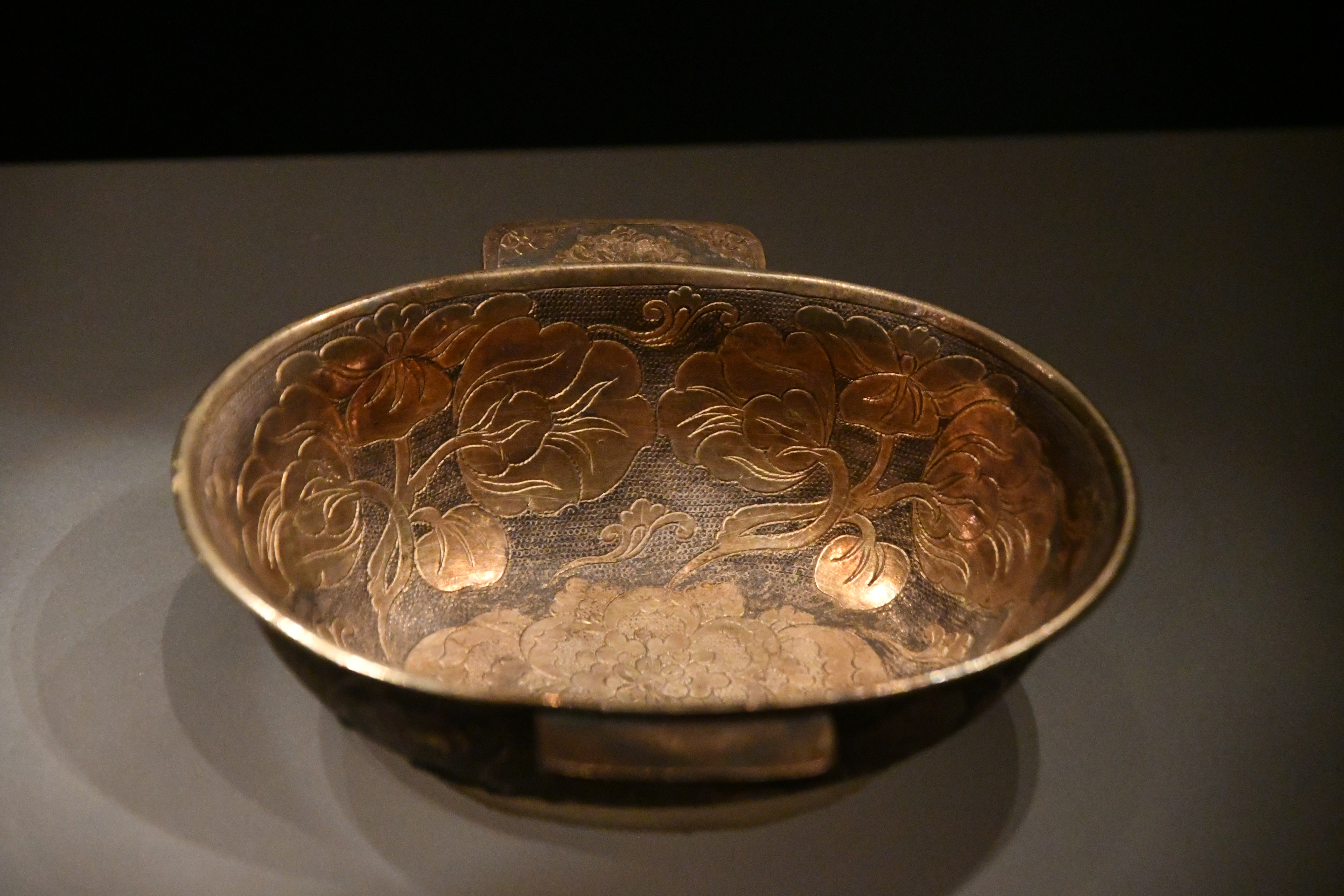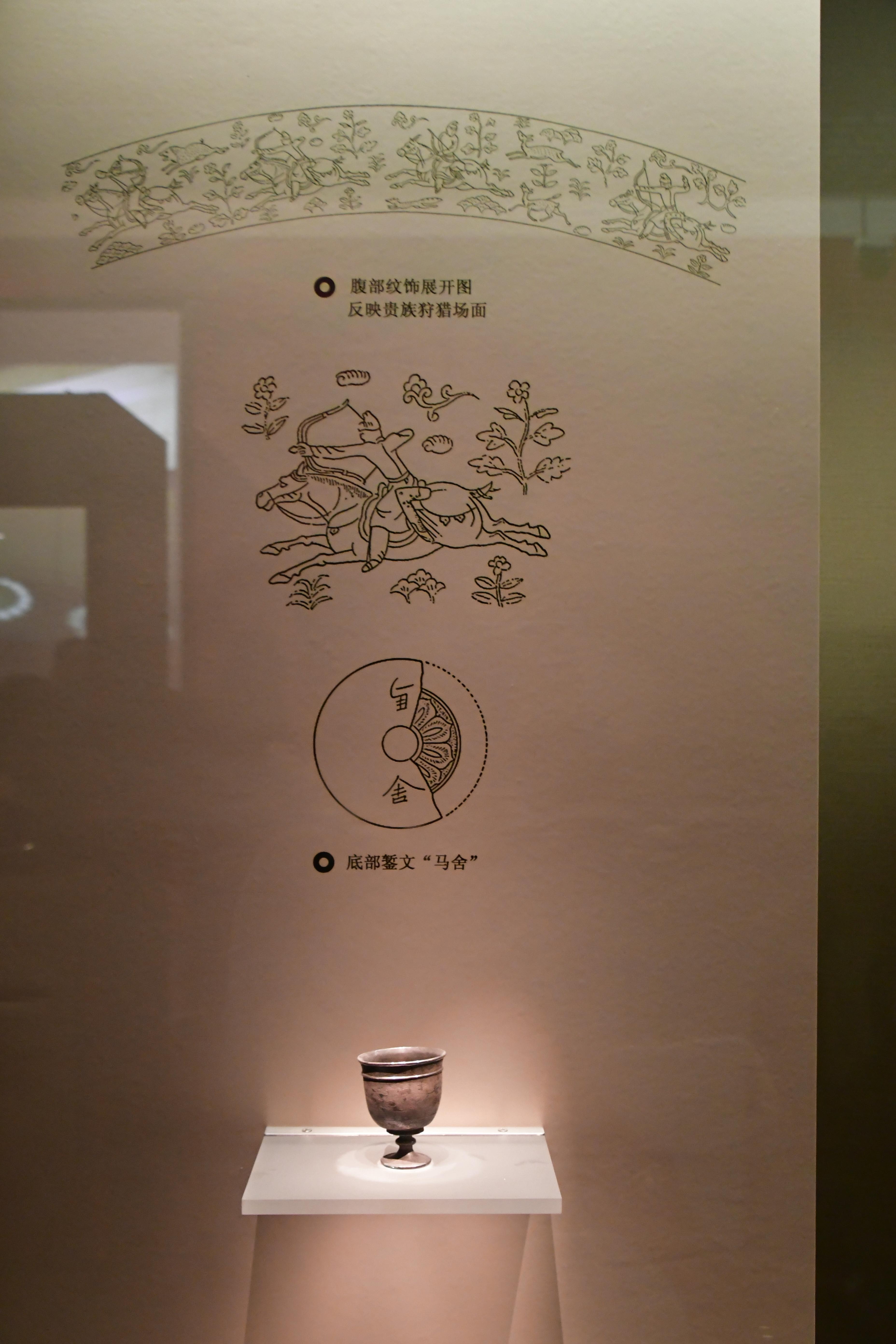 이것은 지금까지 발견된 당나라 금은기 중 가장 웅장한 작품이다. 당나라 당시 중앙 정부의 작업장에서 제작되었을 가능성이 높다. 안쪽 벽에는 "구냥삼(九兩三)"이라는 먹으로 새겨진 글씨가 있는데, 아마도 당나라 관리가 이 물건의 무게를 측정한 후 남긴 기록일 것이다.