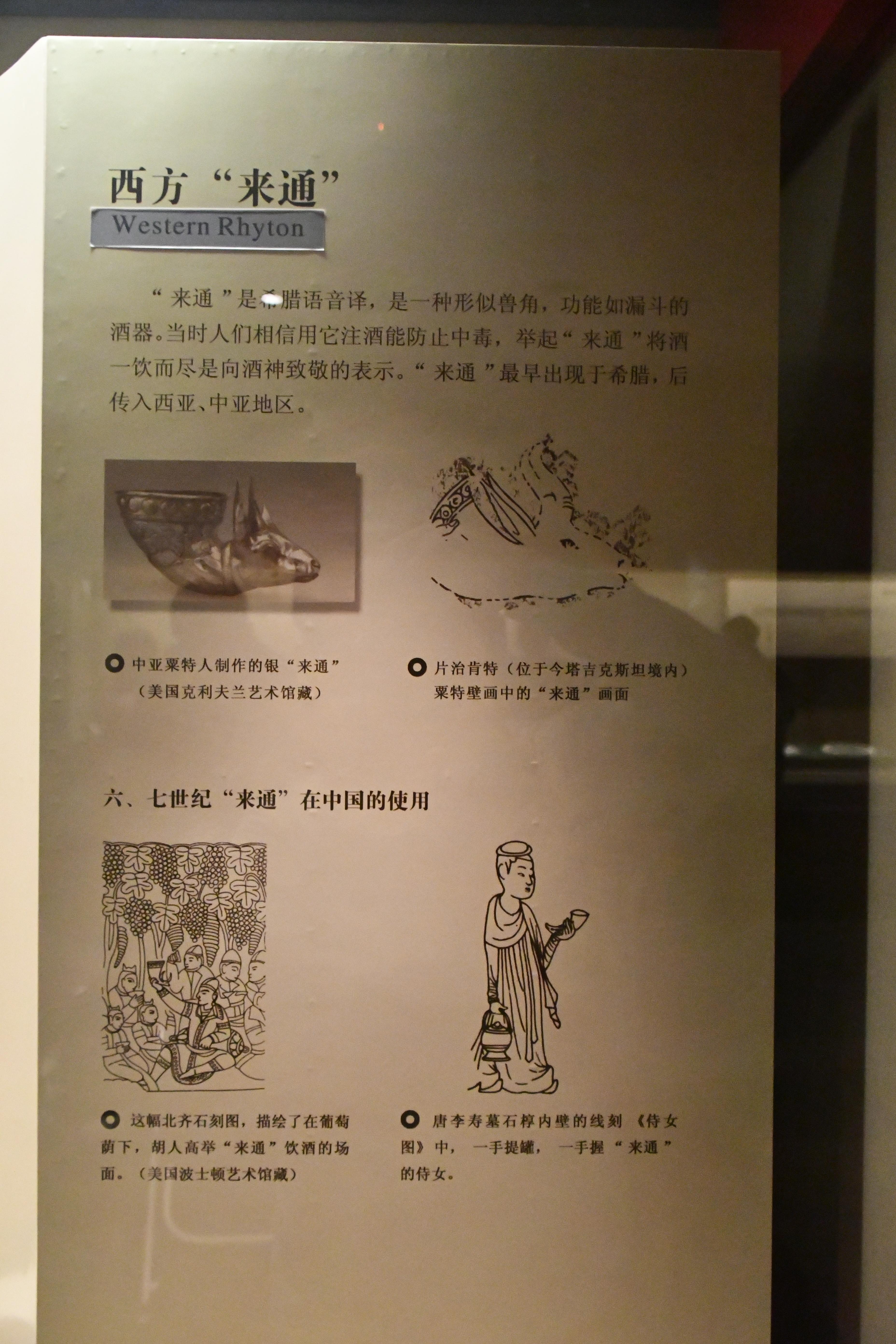 “来通”是希腊语音译, 是一种形似兽角, 功能如漏斗的酒器。当时人们相信用它注酒能防止中毒, 举起“来通”将酒一饮而尽是向酒神致敬的表示。“来通”最早出现于希腊, 后传入西亚、中亚地区。