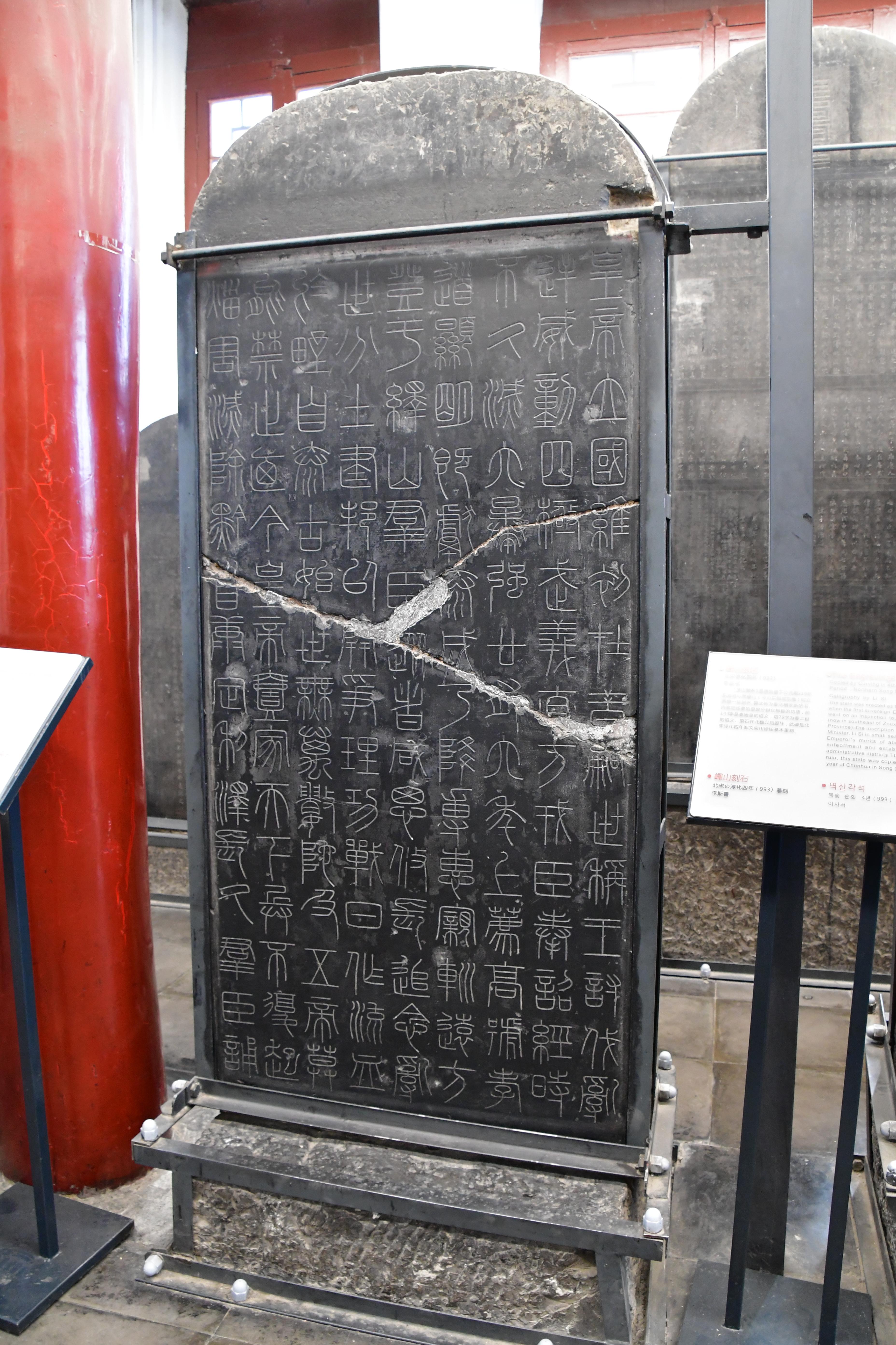 《嶧山刻石》是秦始皇於公元前二一九年東巡途中登嶧山(今山東鄒城東南)時立的第一塊刻石。碑文傳為秦丞相李斯所書,內容頌揚秦始皇廢分封立郡縣的功績。前一百四十四字是秦始皇的詔文,後七十九字為秦二世的詔文。原石在北魏以後毀壞,此碑是北宋淳化四年鄭文寳用徐鉉篆本重刻。