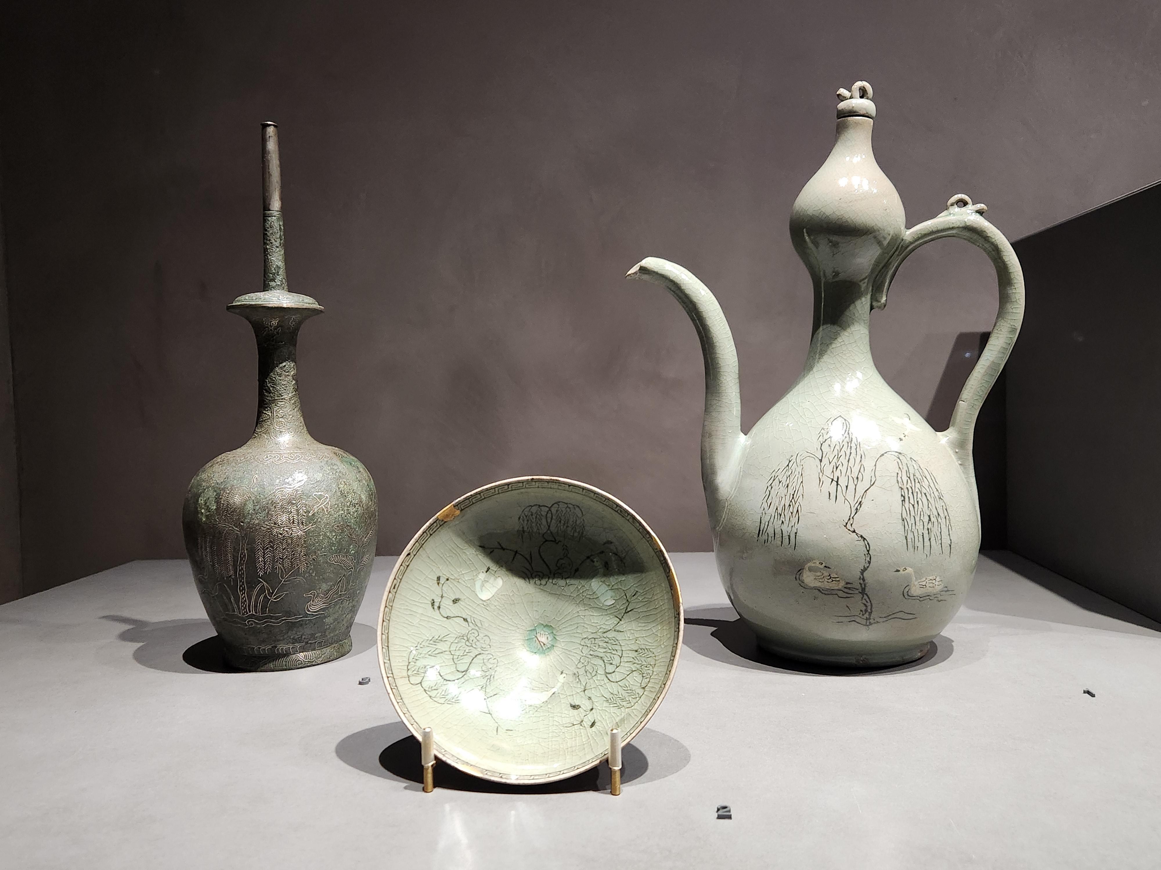 ◆ 정병, 사발[碗], 버드나무와 물새를 문양을 상감한 조롱박 모양 주전자.